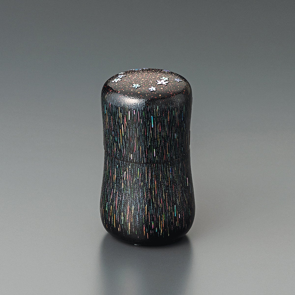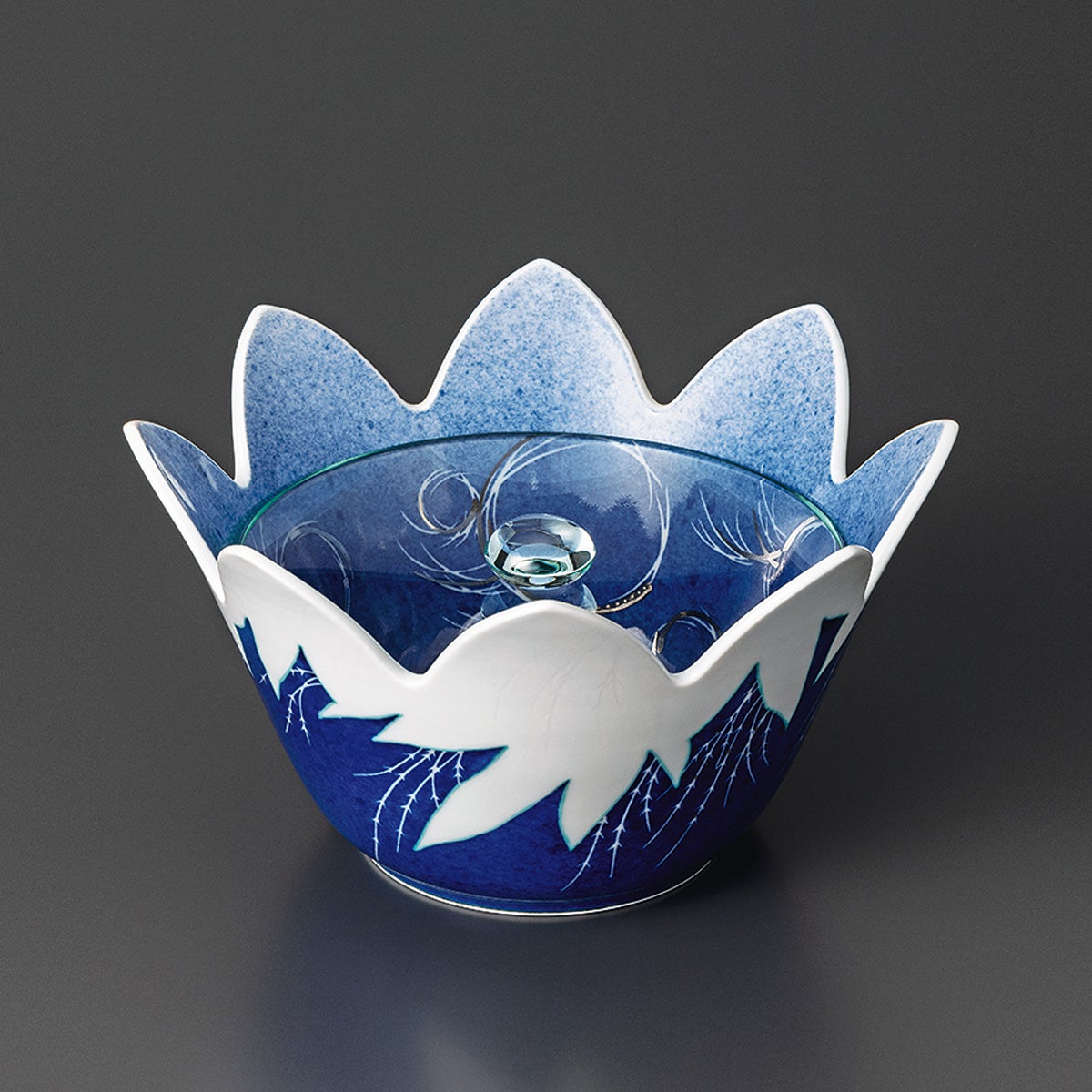 1.十四代 今泉今右衛門「色絵雪花吹墨墨はじき柳文水指」2023年, 安達征良「硝子水指蓋 空」2023年