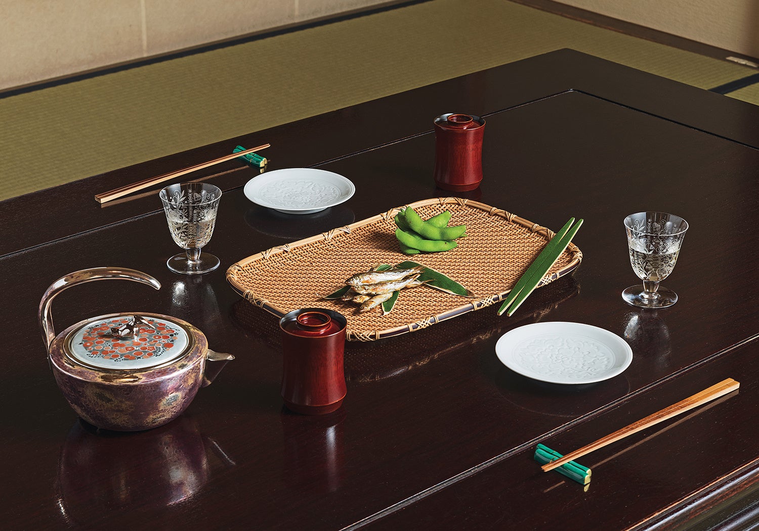 「工藝を我らに」は、2015年から始まった資生堂アートハウス主催のグループ展です。メンバーを替えながら「第一次」(2015-2017)、「第二次」(2019- )と続き、「第二次 工藝を我らに」の最終回となる本展は、十四代 今泉今右衛門(陶藝)、中條伊穗理(漆藝)、三代 𠮷羽與兵衛(金工)、安達征良(ガラス工藝)による新作に加え、藍染めの染織作品で世界的な評価を受けている福本潮子の「茶室」を舞台に、メンバー自らがお茶を楽しむための道具類を発表します。