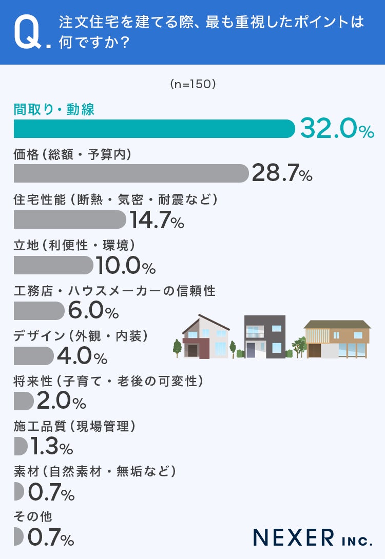 最も多かったのは「間取り・動線」で32.0%でした。次いで「価格(総額・予算内)」が28.7%、「住宅性能(断熱・気密・耐震など)」が14.7%と続いています。