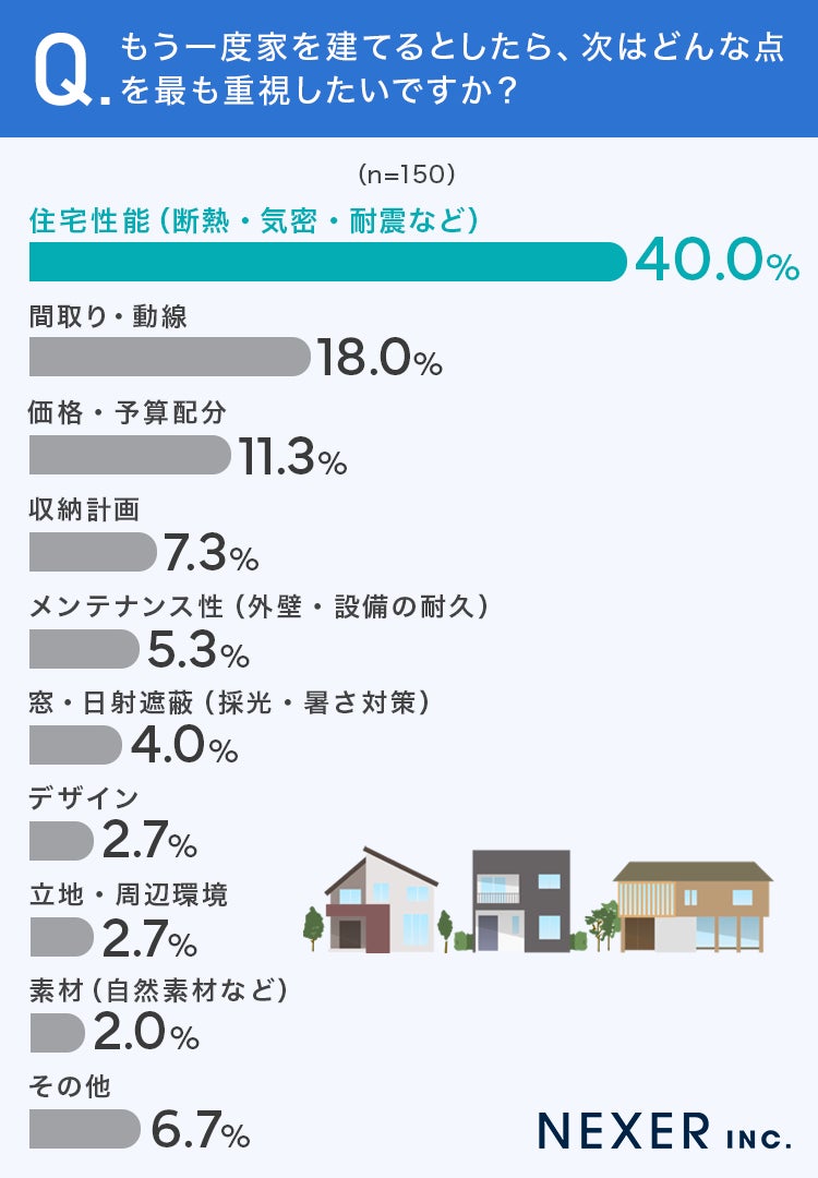 今回の調査では、注文住宅を建てる際に最も重視されたポイントは「間取り・動線」でしたが、もう一度建てるなら「住宅性能」を重視したいという方が40.0%で最多となりました。