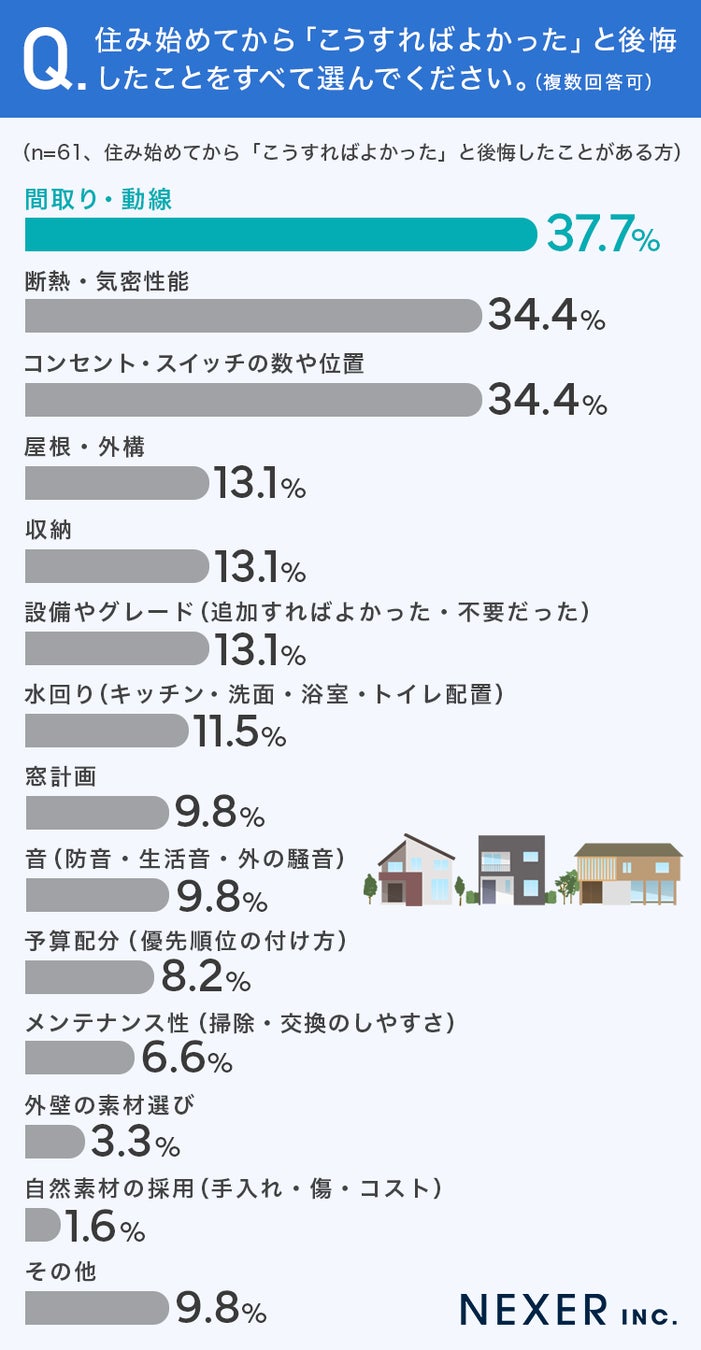 最も多かったのは「間取り・動線」で37.7%でした。僅差で「断熱・気密性能」と「コンセント・スイッチの数や位置」がともに34.4%で続いています。