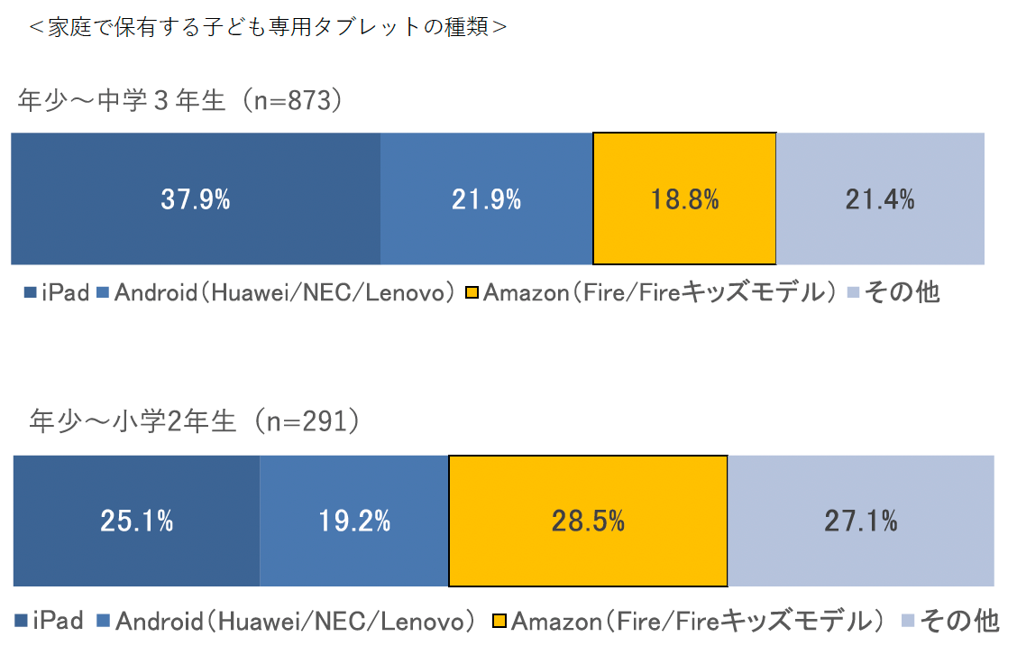 家庭内で子ども専用端末として保有するタブレットについて聞いたところ、Amazon Fire タブレットシリーズは年少〜中学3年生のお子さまでは18.8%、年少〜小学2年生では28.5%占めている。(※1)