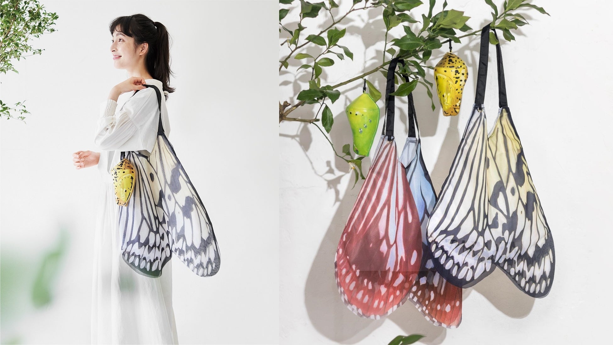 蝶の神秘的な生態を、サナギポーチから出てくる蝶の翅(はね)のエコバッグで表現しました。