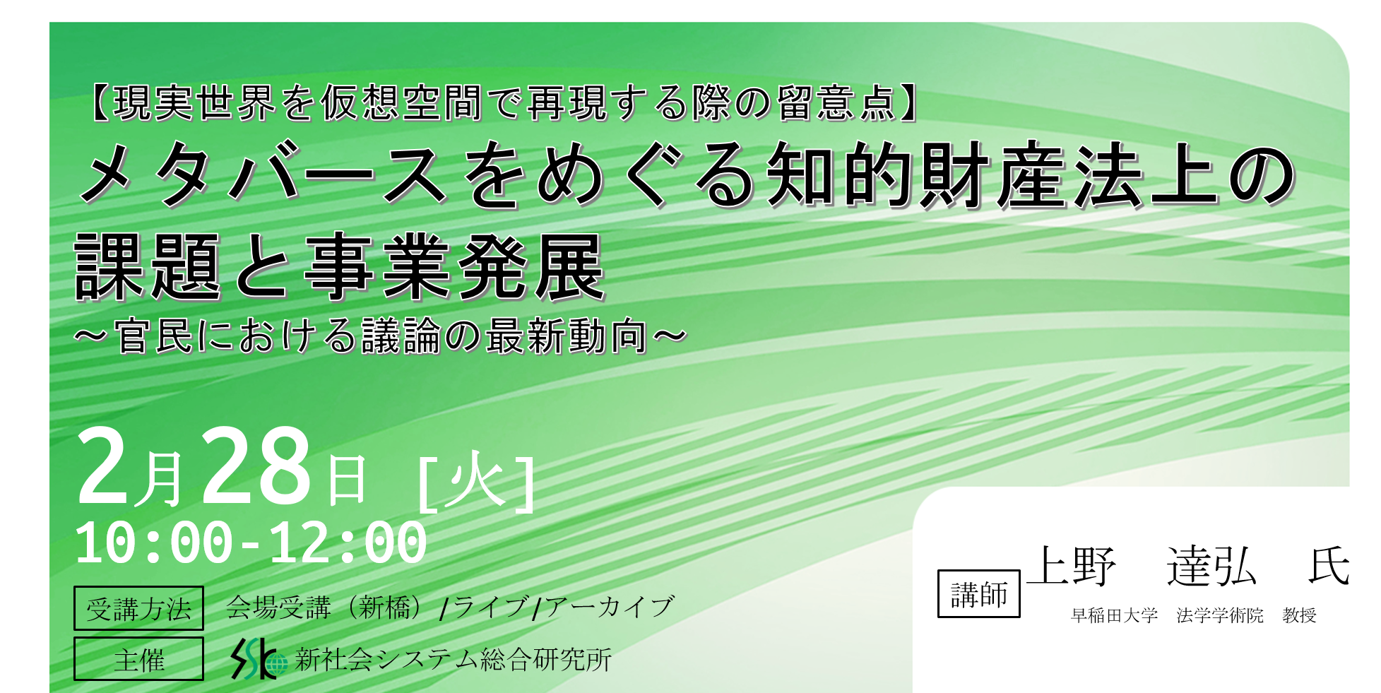 「メタバースをめぐる知的財産法上の課題と事業発展」と題して、早稲田大学 法学学術院 教授 上野 達弘氏のセミナーを2023年2月28日(火)に開催!!