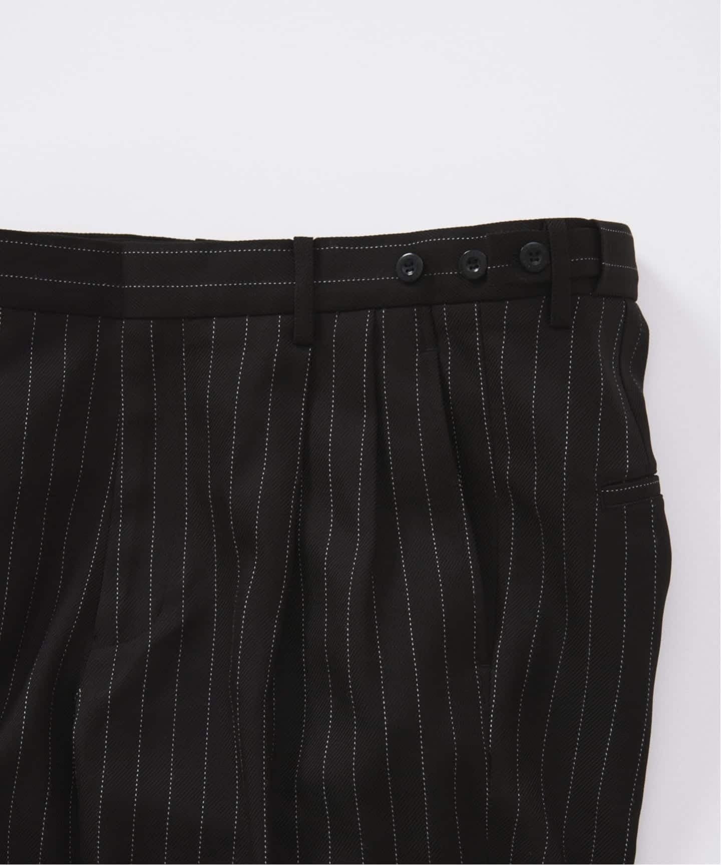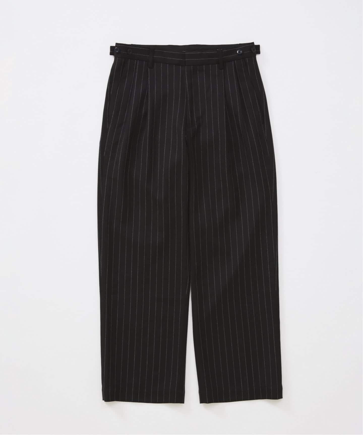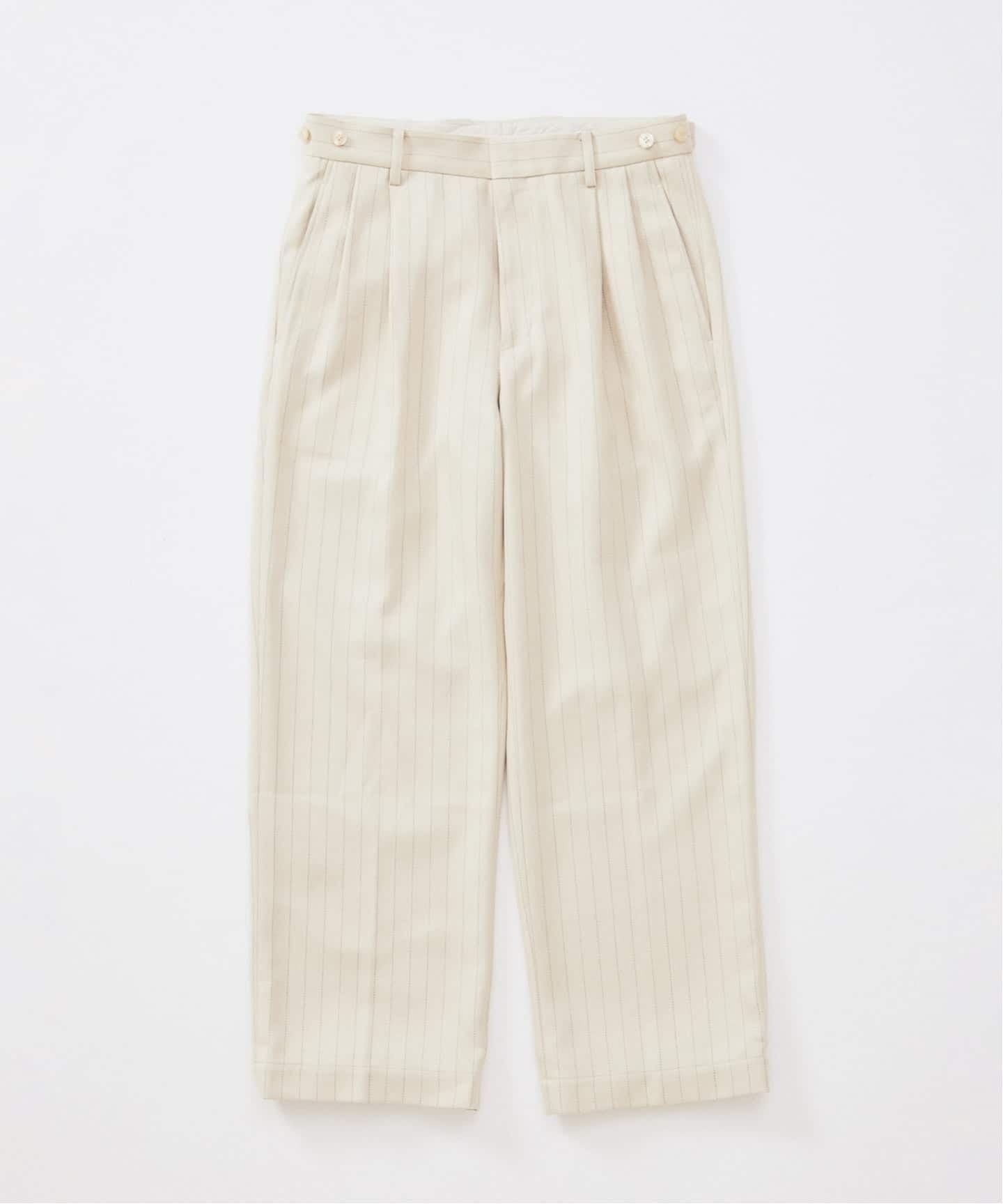 継続して展開しているテニストラウザーは、ブランドのアーカイブにおいても象徴的なテキスタイルであるピンストライプを採用し、オリジナル素材として再設計。家庭洗濯が可能なスペックを備えながらも、糸の光沢を抑えることで天然素材のような柔らかい風合いを実現した。