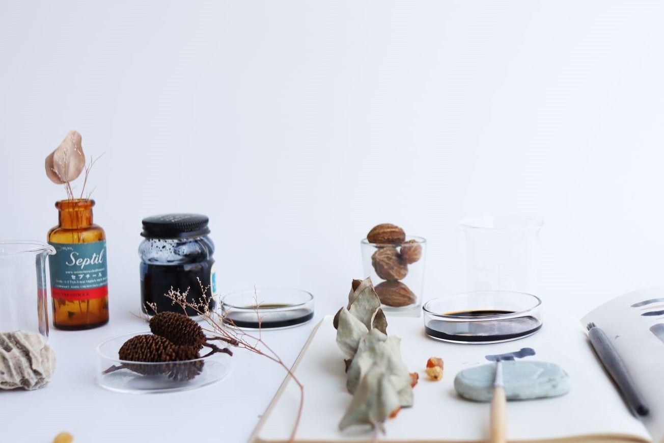 植物から抽出した染料をブレンドしてオリジナルの筆記用インクを作ります。コーヒーから抽出した染料も。