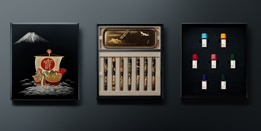 人間国宝 故・松田権六氏が創設した蒔絵工芸作家集団「國光會(こっこうかい)」の11名の名匠が卓越した技術の粋を尽くして7本の万年筆に描いた「七福神」。2018年に世界限定25セットで販売された特別なセットです。