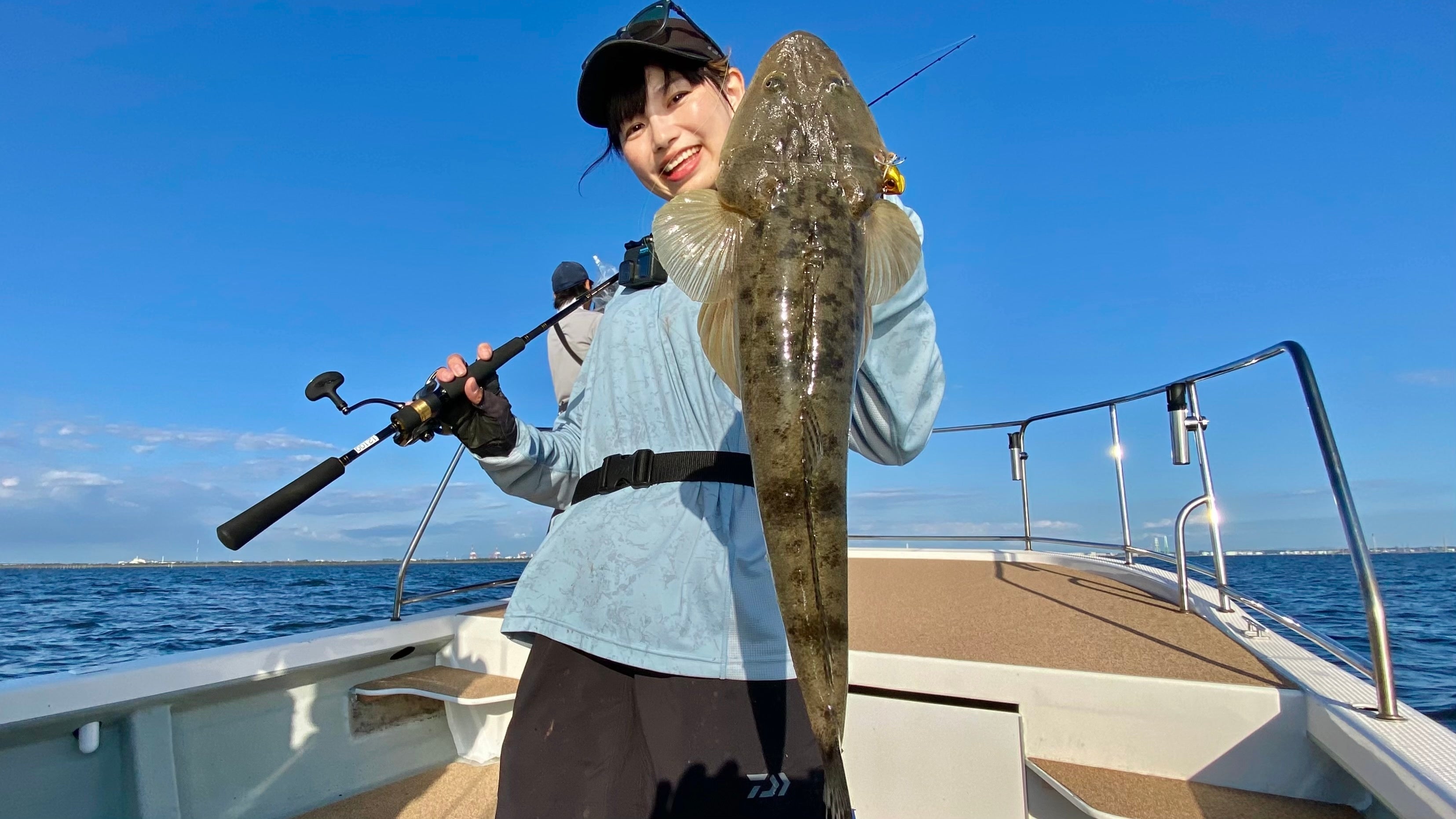 続けて、田上にヒット!釣りあげたのは50センチオーバーのグッドサイズのマゴチ。田上の伊勢湾ファーストフィッシュ。
