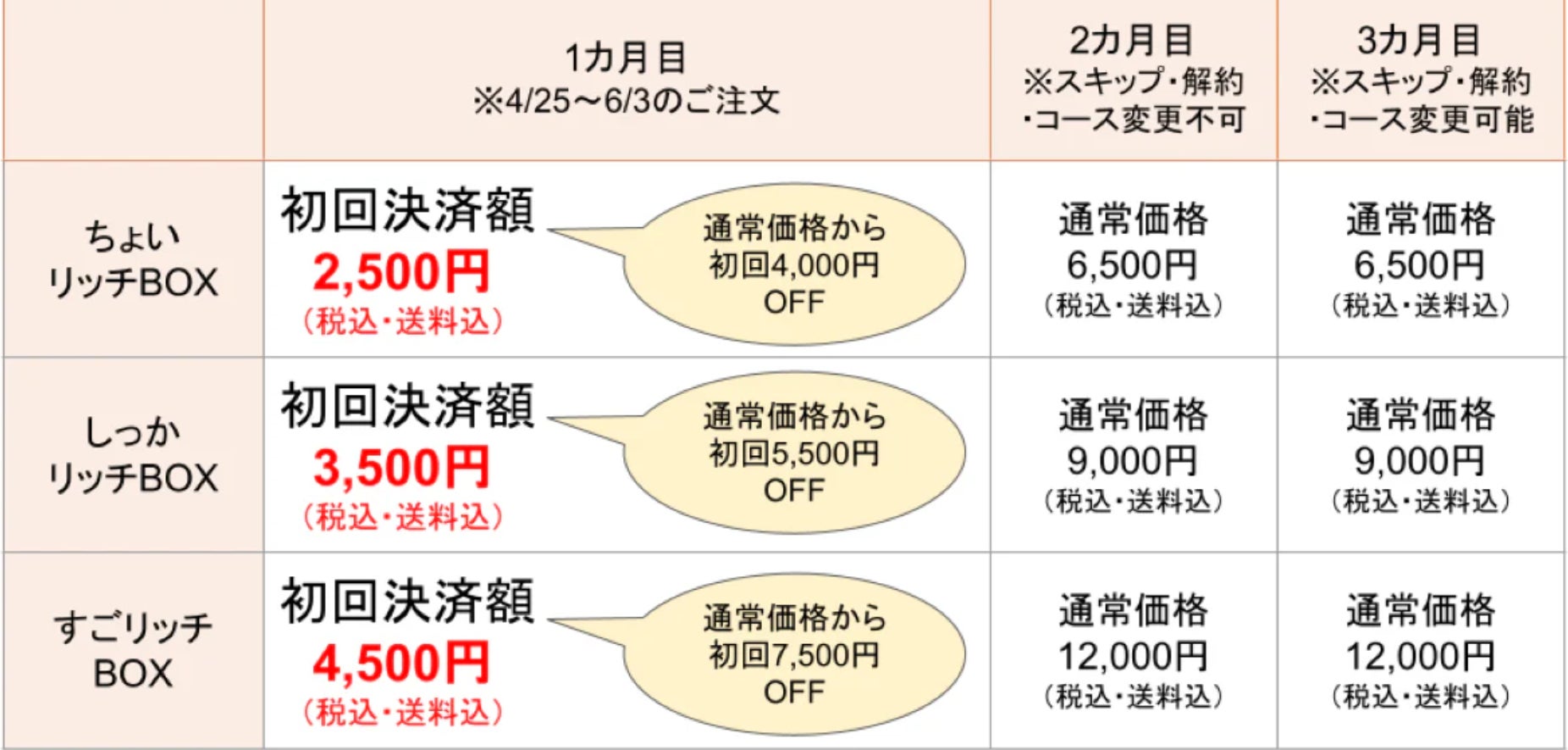 ・本キャンペーンは定期お届けコース(ちょいリッチBOX・しっかリッチBOX・すごリッチBOX)の新規購入に限り適用されます。