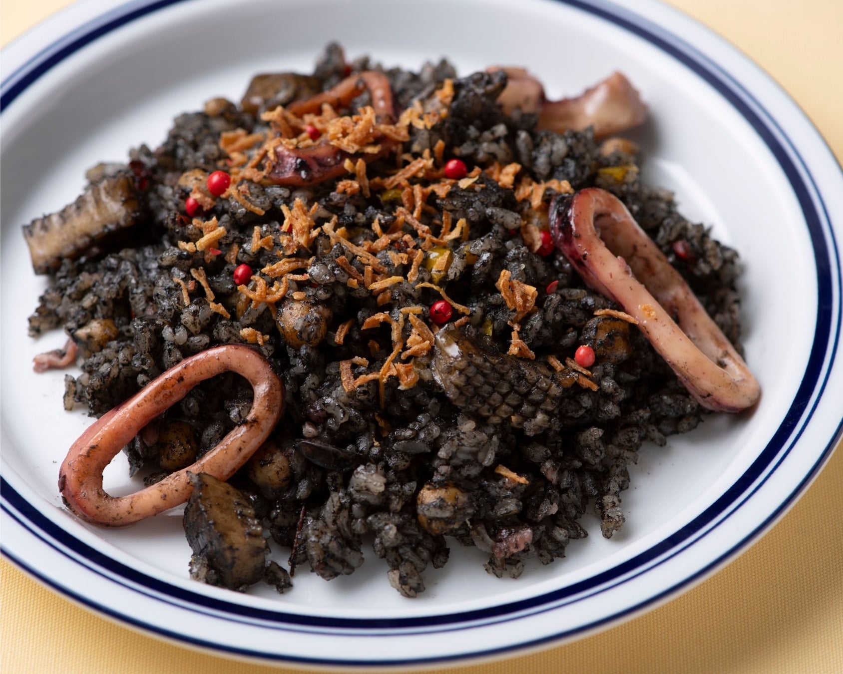 ロス・レイエス・マーゴス完全監修商品。野坂シェフが半年以上に渡ってこだわり抜いたレストランの味を限りなく再現しました。イカ墨の香り高いパエリヤに仕上げています。