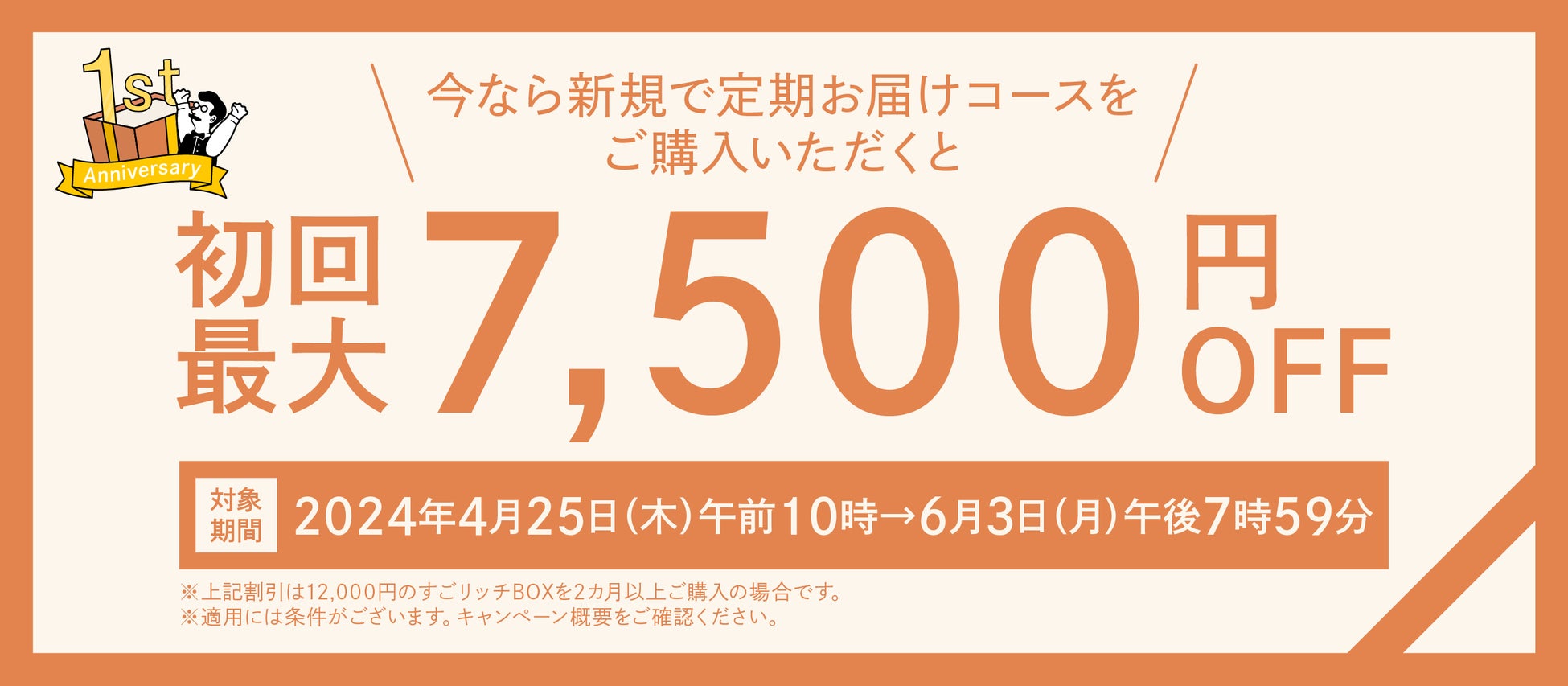 ラクリッチ1周年を記念して、対象期間中に定期お届けコース(ちょいリッチBOX、しっかリッチBOX、すごリッチBOX)をそれぞれ初回のみ割引価格にてご購入いただけます。
