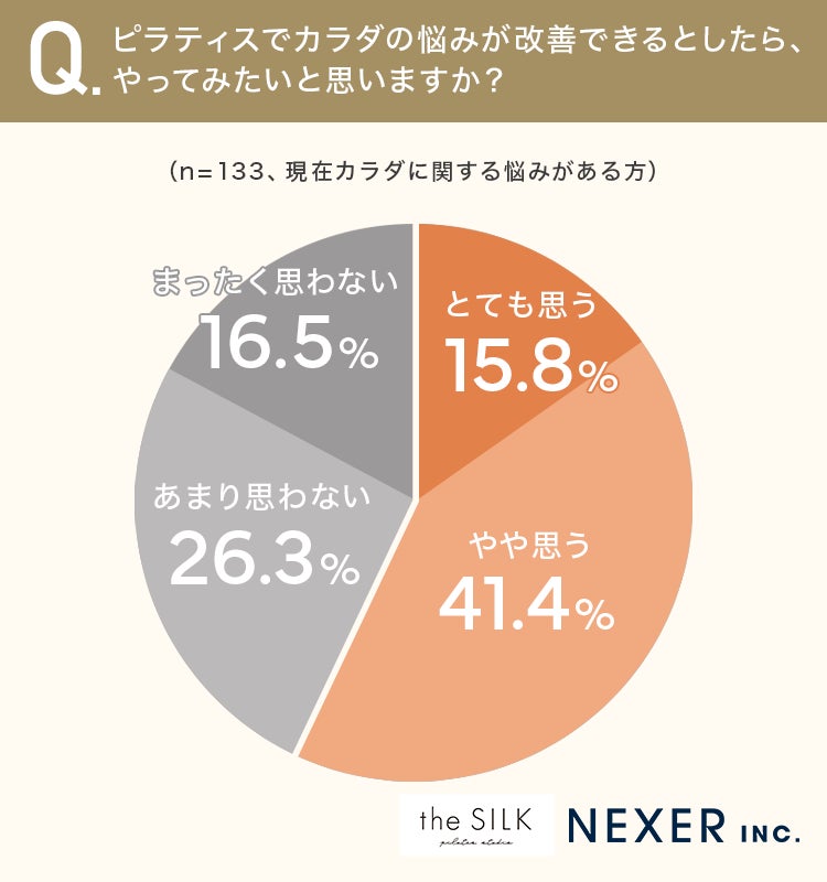 ピラティスについては、悩みが改善できるなら「やってみたい」と答えた方が57.2%にのぼり、カラダの内側から整えたいという潜在的なニーズの高さがうかがえます。
