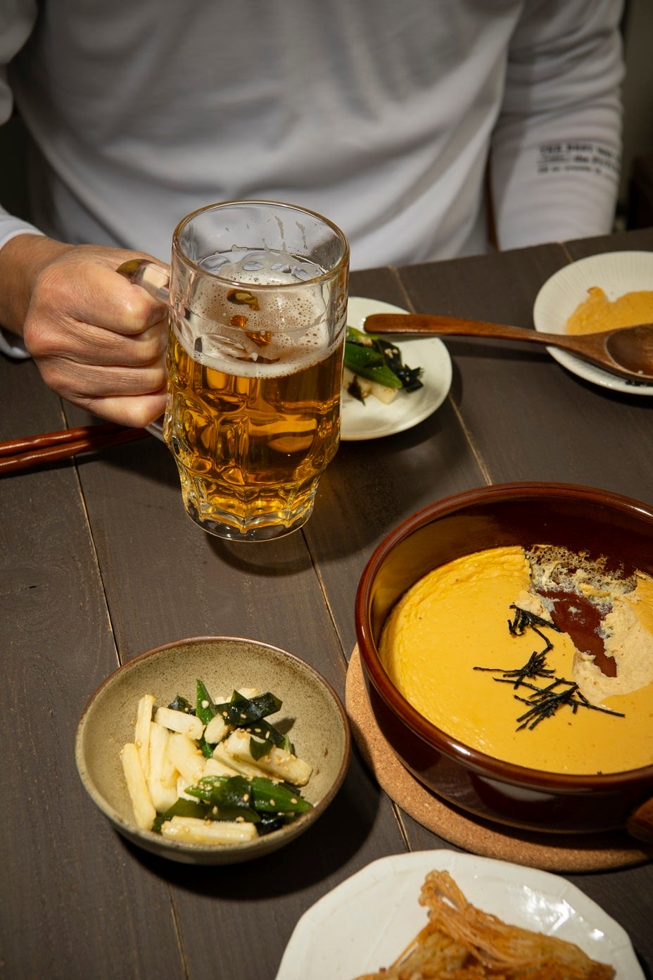 晩酌は一日の楽しみ。まずはビールで乾杯! おつまみがわりのおかずは、居酒屋で出てきそうなものですが、カロリーと塩分は控えめで、たんぱく質やビタミン、ミネラル、食物繊維がたっぷり。ゆる糖質オフを心がけています。