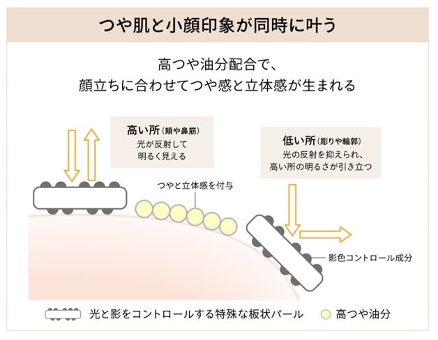 <立体感を演出する 特殊な板状パール×高つや油分による瞬間コントゥアリング処方>