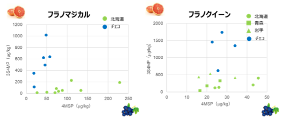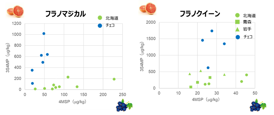 具体的には、チェコで収穫されたフラノクイーンの3S4MP含量は国産よりも6倍高く(P < 0.05)、逆に、4MSPの含量はチェコ産よりも国産の方が高い傾向にあった。