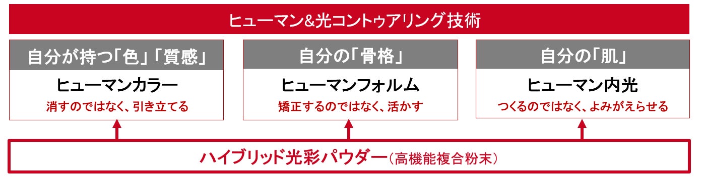 人がもつ骨格、色、質感を3次元で引き出す「ヒューマン&光コントゥアリング技術」を採用。光と影の技術を集結させた高機能複合粉末体で実現します。