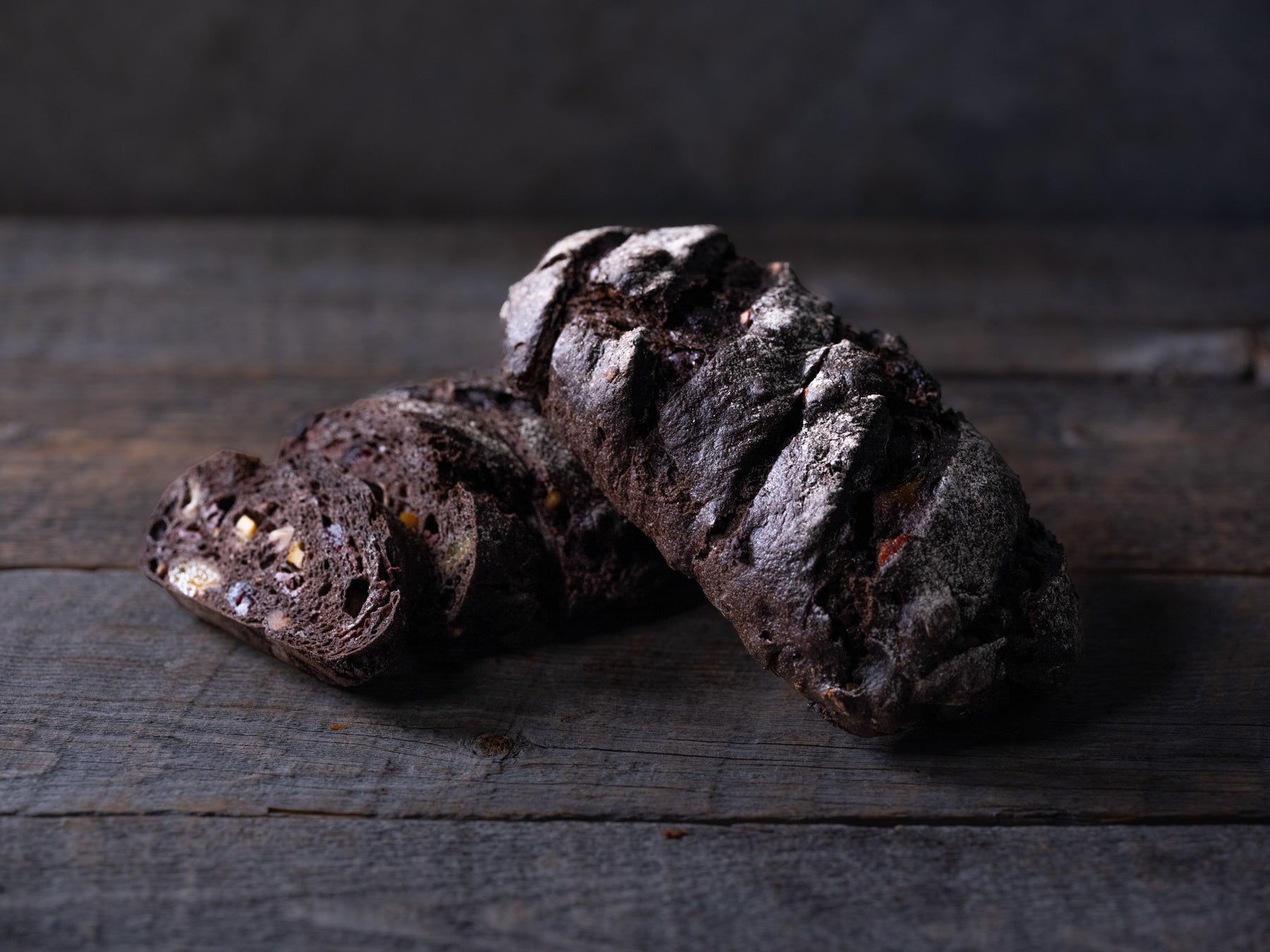 「ショコラ」のテーマに合わせ、お店の定番メニュー「セーグルフリュイ」をチョコレートバージョンに仕上げています。フランス産の小麦粉と北海道「庄司農場」のライ麦粉にココアを加え、ドライフルーツ、くるみ、チョコレートチップを練りこんで焼き上げたハード系パン。甘さ控えめなのでジャムやホイップ、生ハムやクリームチーズなどともマッチし、幅広くお楽しみいただけます。