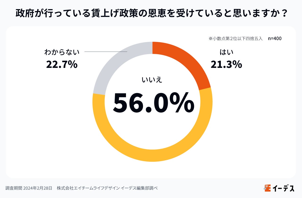 賃上げ政策の恩恵を受けていると感じている人は21.3%、感じていない人は56.0%