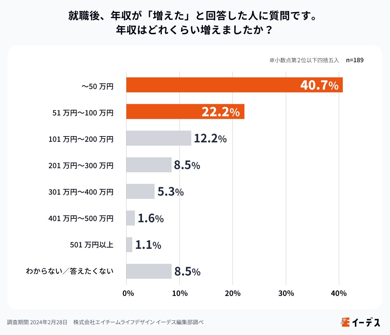 また、「増えた」と回答した人のうち、一番多かった回答が「~50万円(40.7%)」で、次いで「51万円~100万円(22.2%)」となりました。