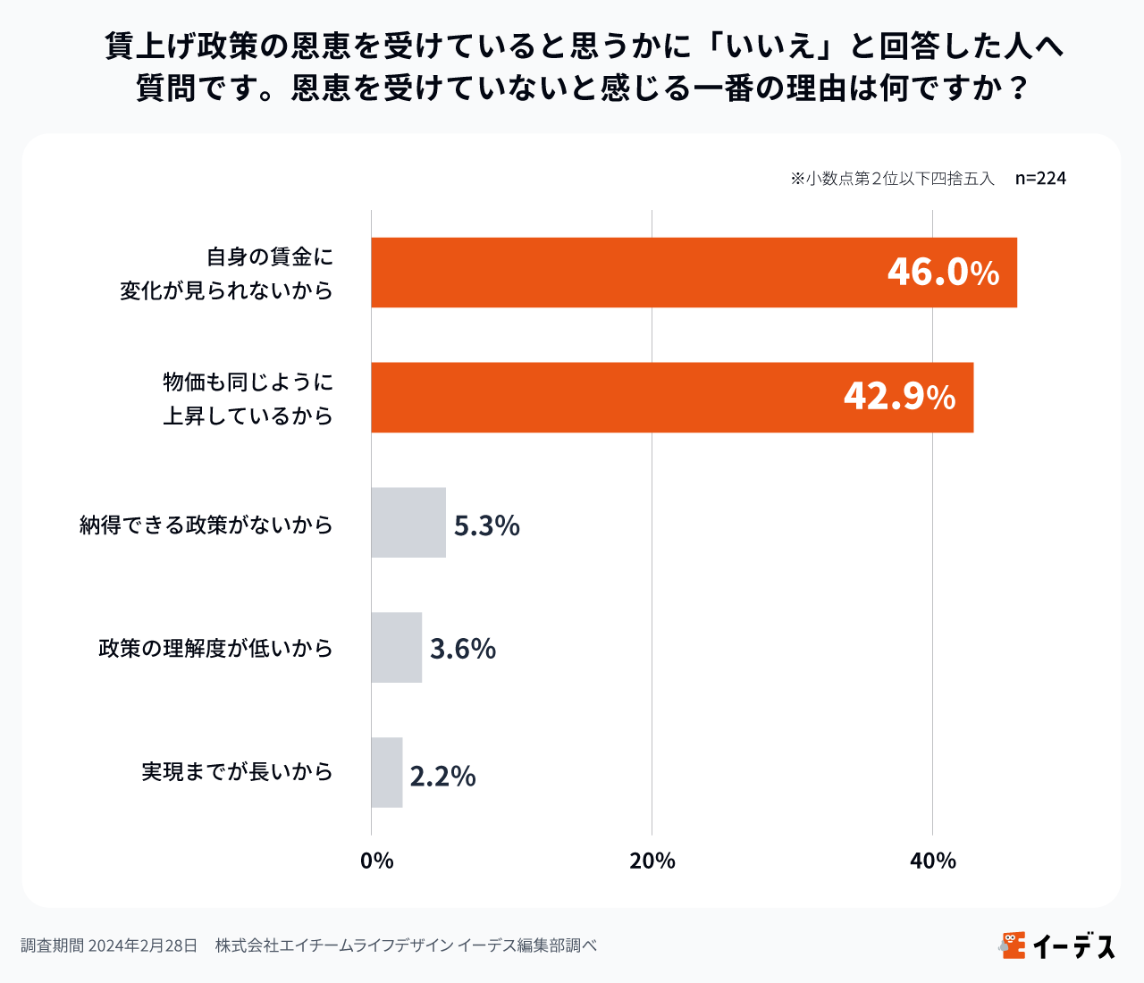 なお、「いいえ」と回答した人に「一番の理由は何ですか?」と質問したところ、一番多かった回答が「自身の賃金に変化が見られないから(46.0%)」で、次いで「物価も同じように上昇しているから(42.9%)」となりました。