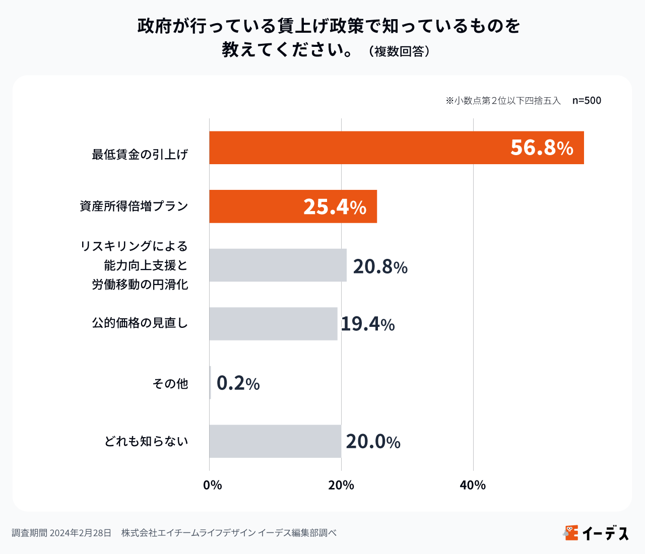 「政府が行っている賃上げ政策で知っているものを教えてください。」と質問したところ、一番多かった回答が「最低賃金の引上げ(56.8%)」で、次いで「資産所得倍増プラン(25.4%)」となりました。