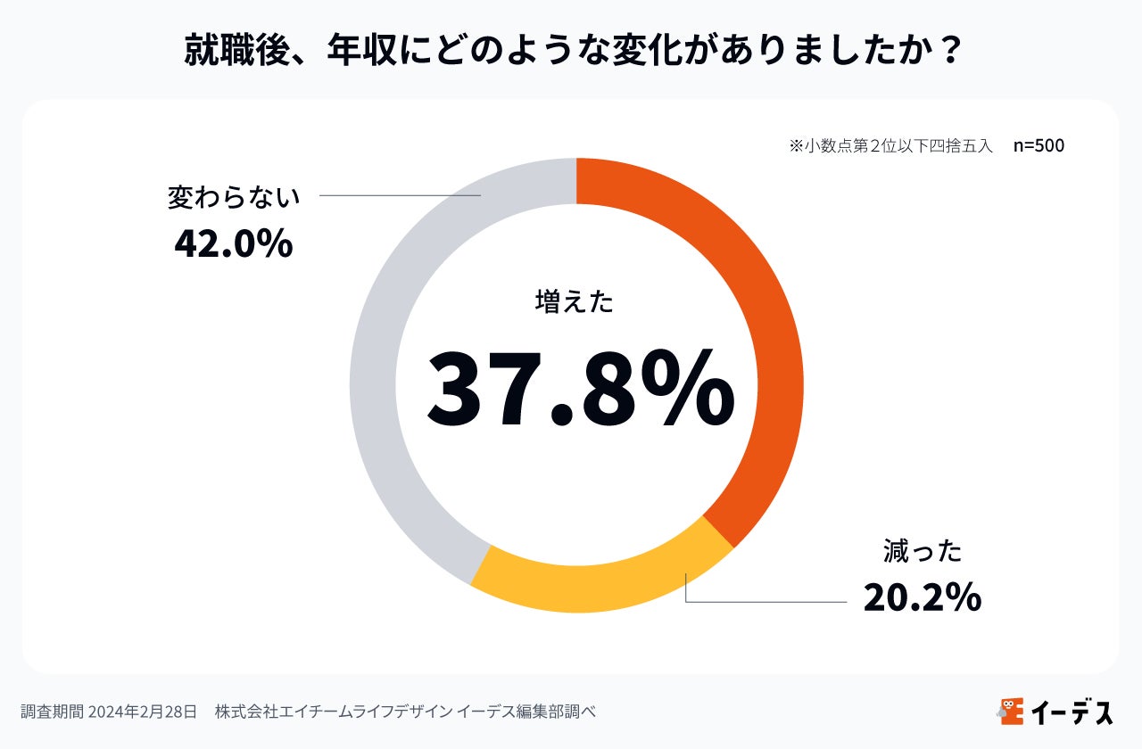 ハローワークを利用して就職した人に「就職後、年収にどのような変化がありましたか?」と質問したところ、37.8%の人が「増えた」と回答しました。