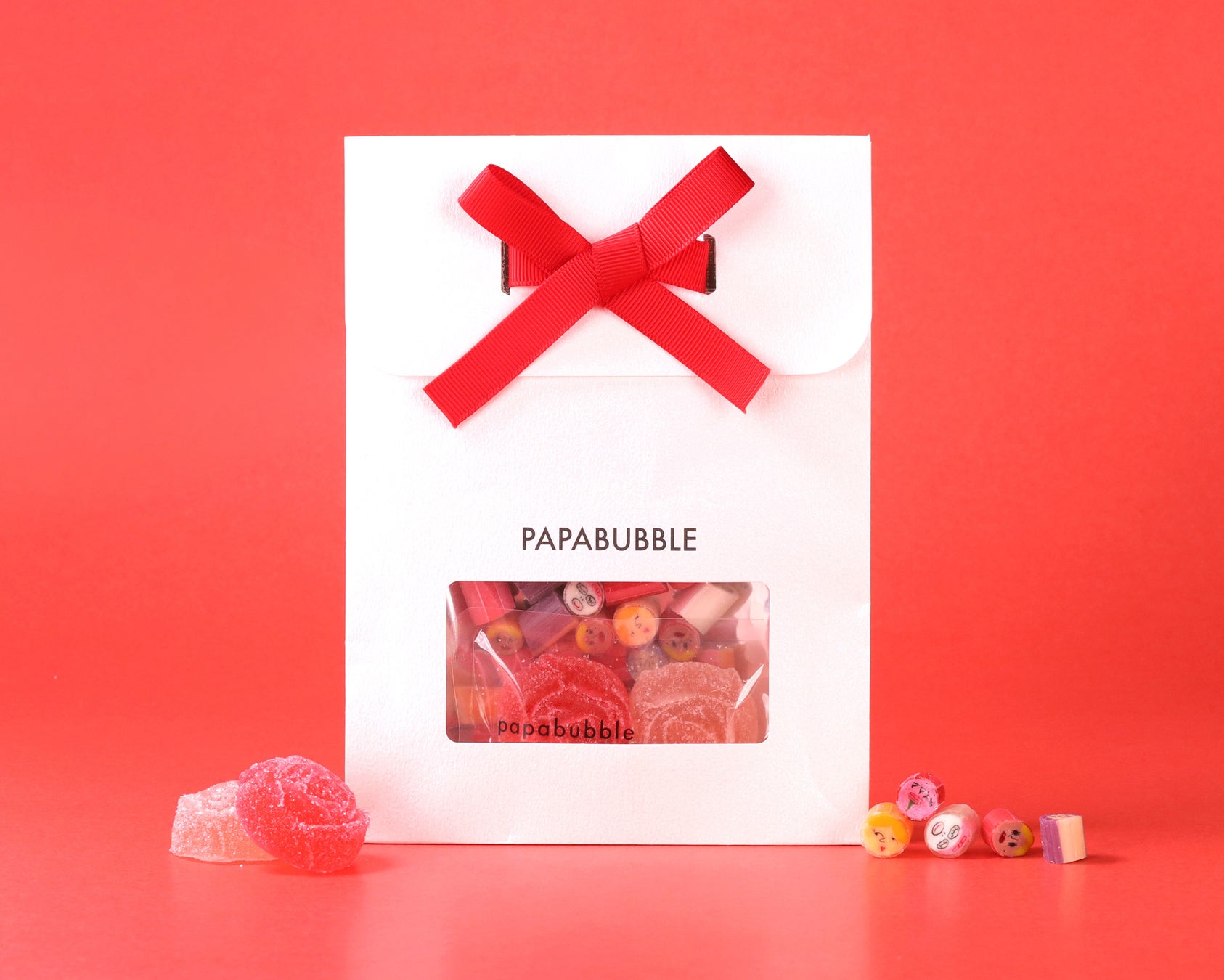 「ありがとう」と「楽しさ」を詰め合わせた母の日ギフトセット。ママの顔をユーモラスに表現した数種のキャンディと、カーネーションをモチーフにした華やかなバブレッツ2個入り。