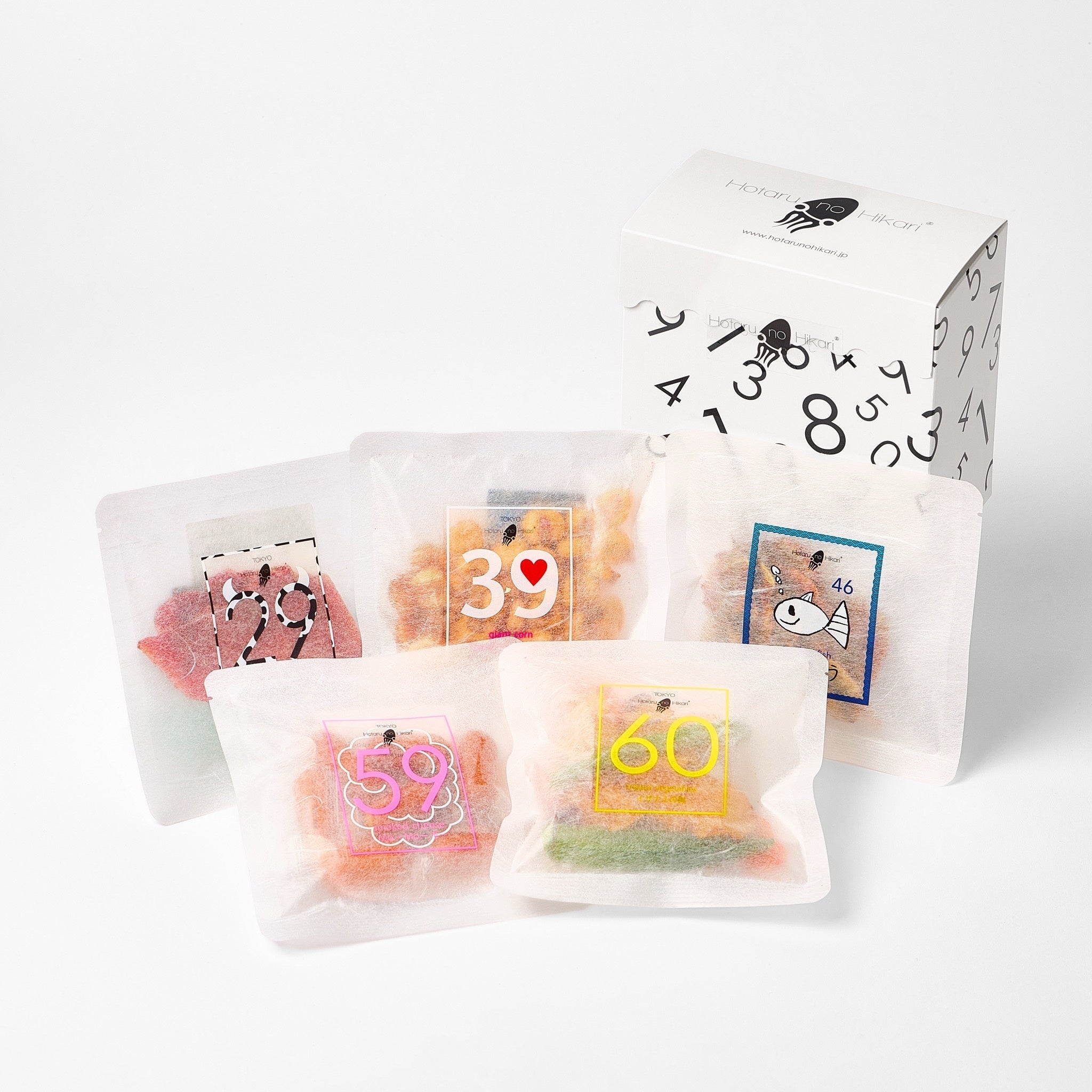 感謝を届けるおつまみギフト。ホタルノヒカリ定番の「No.39梅昆布ジャイアントコーン」をはじめ、「No.59スモークチーズ」や「No.60野菜チップス」など、女性に人気なおつまみを詰め合わせました。