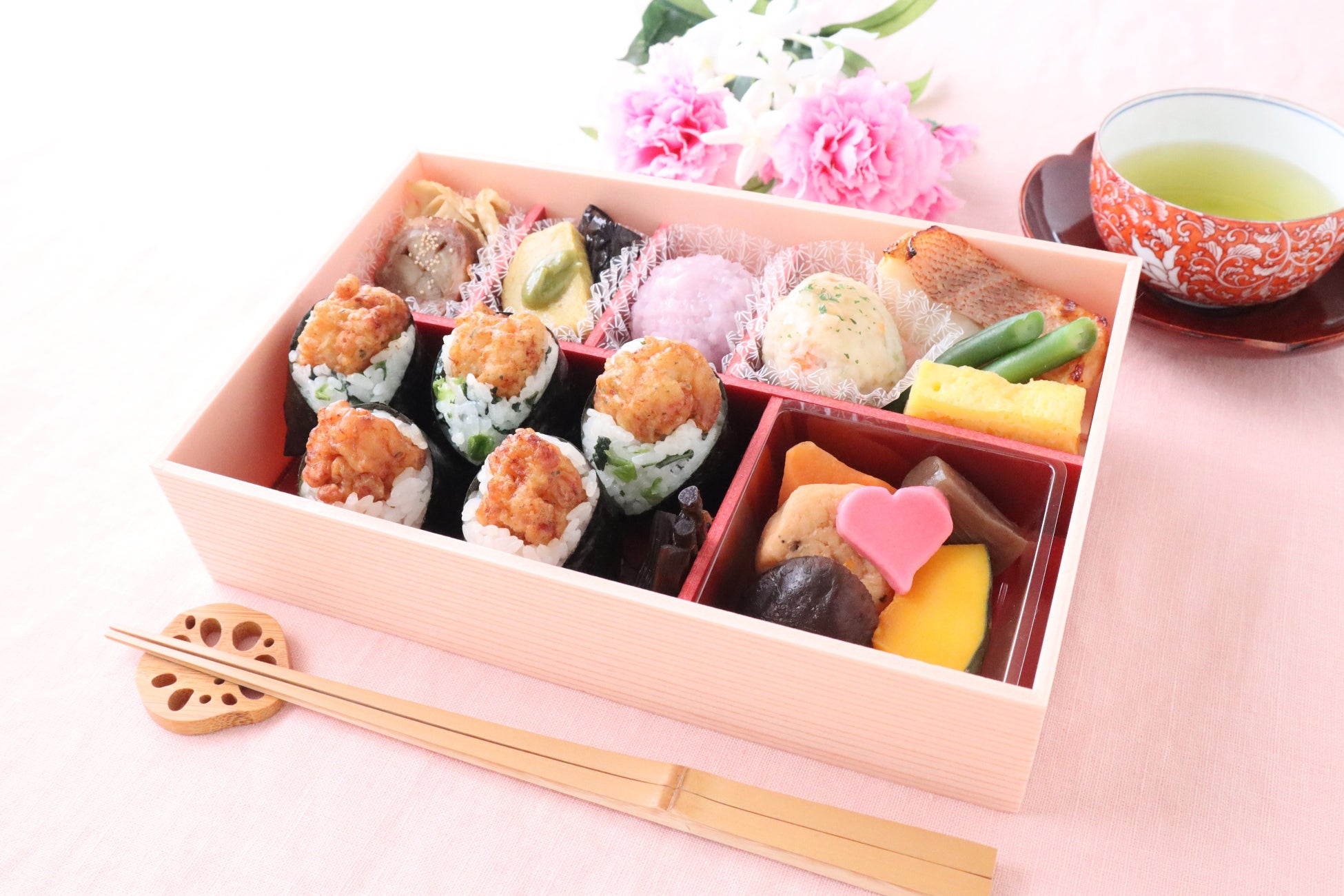 白米天むす2個・青しそ高菜天むす3個とおかずには鶏しんじょうに赤魚西京焼が入り、デザートには桜餅。母の日限定特別弁当です。