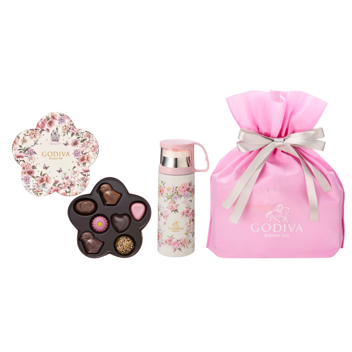 春らしい色とりどりの花を表現したフラワー形のパッケージの心躍るチョコレートの詰め合わせと、オリジナルデザインのステンレスボトルをセットにしました。