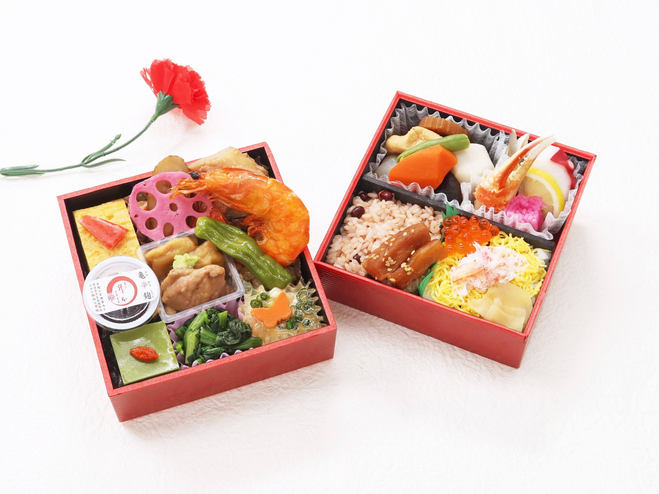 金目鯛の煮付けや湯葉の餡掛け、赤飯・蟹ちらし寿司に抹茶羊羹など、割烹職人こだわりの味をお弁当に盛り込みました。