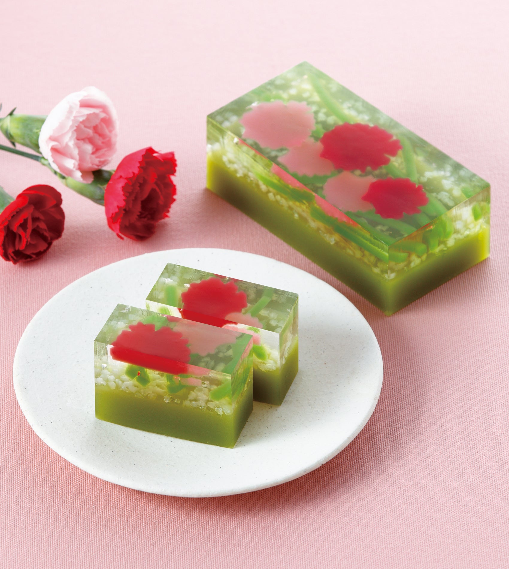透きとおった錦玉羹に道明寺を散りばめ、赤とピンクの羊羹を浮かべて、カーネーションの花束を表現した棹菓子。