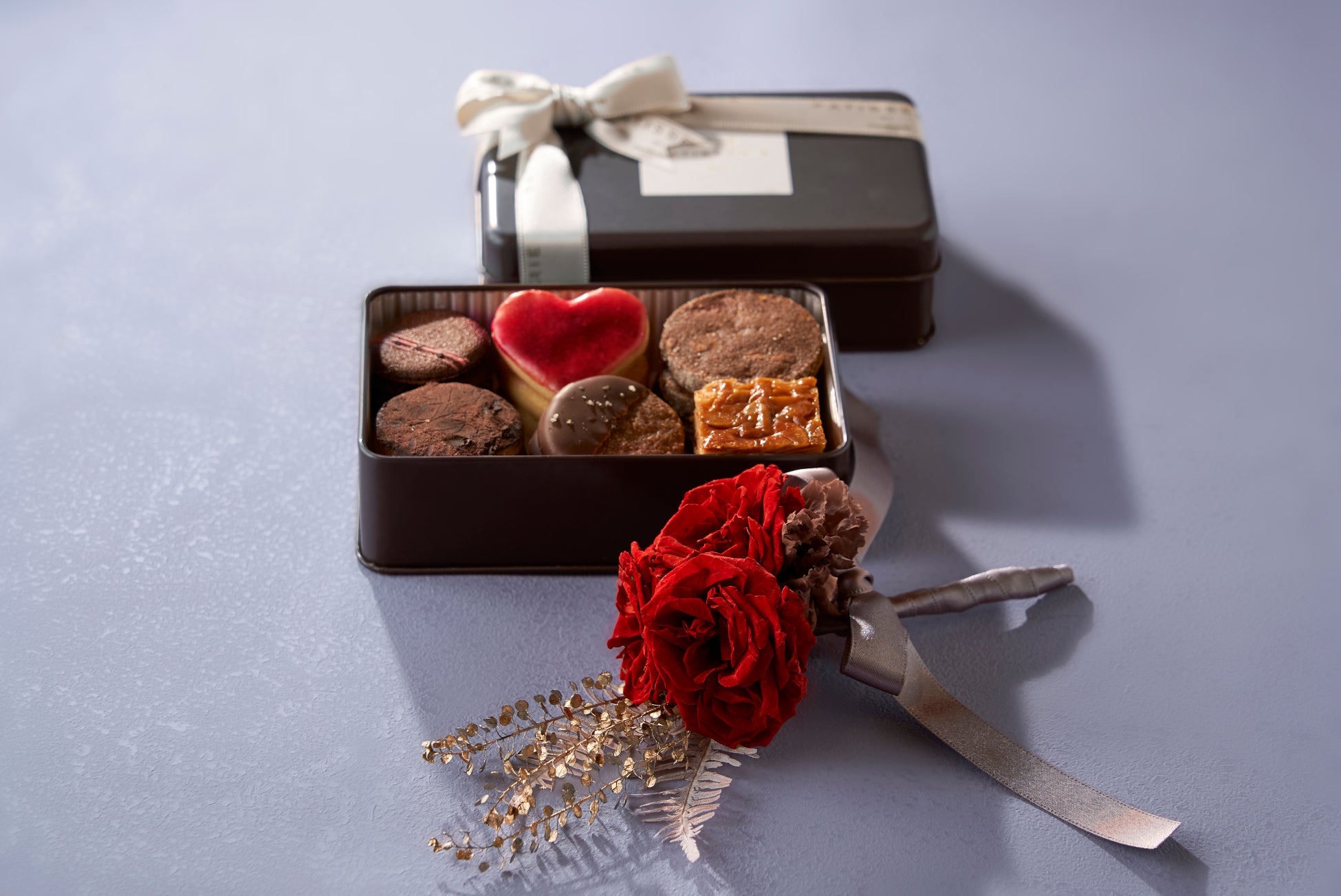 毎年人気の「バレンタインクッキー缶」、ユー花園とのコラボレーションによるプリザーブドフラワーやエレガントな赤いバラのミニブーケを添えた華やかなフラワーギフトに加え、果実の香りとショコラの奥行きを重ねた新作「果内水晶ショコラ(Kanai Suisho Chocolat)」を100個限定で販売します。