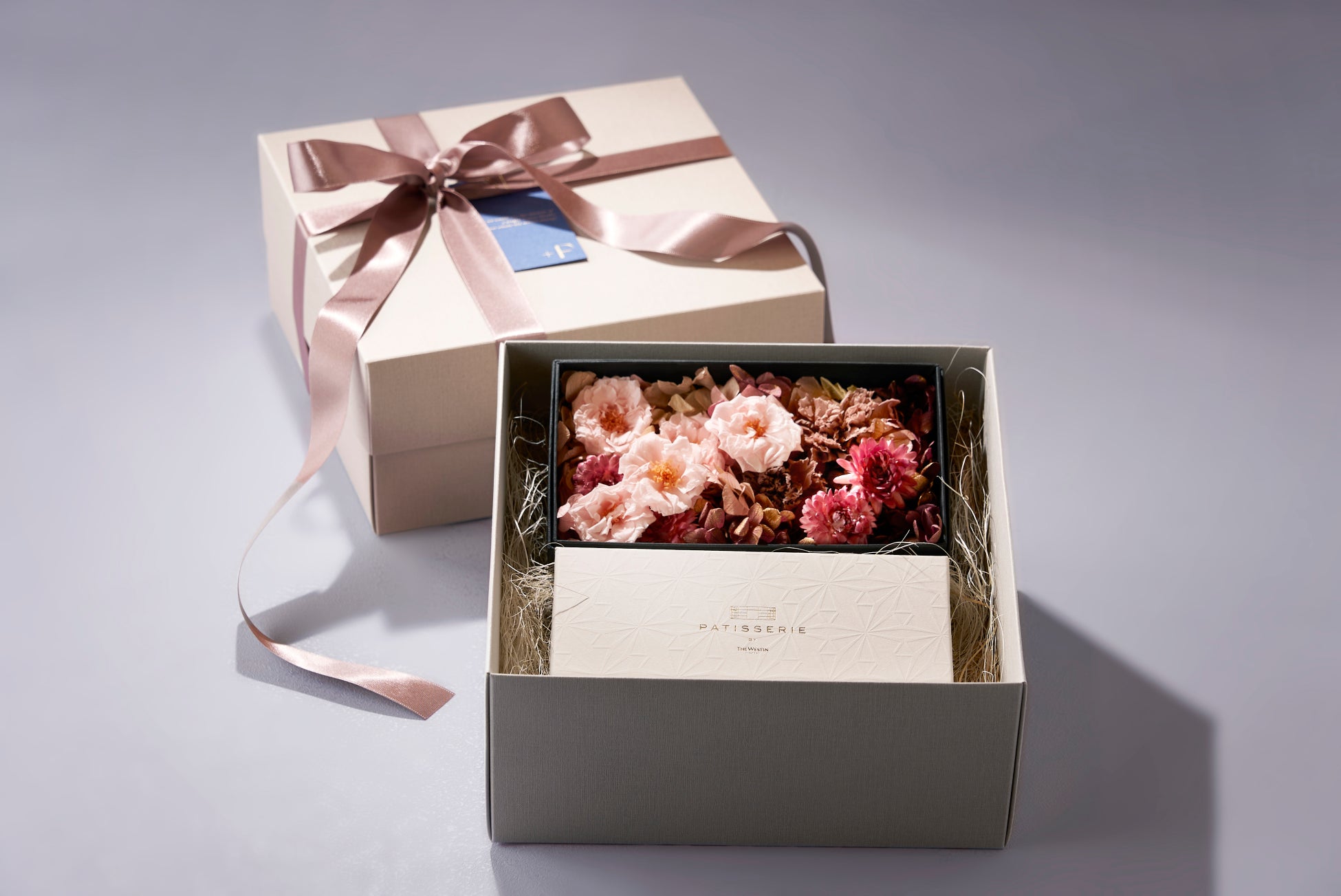 プリザーブドフラワーのギフトBOXに、ホテルメイドの「果内水晶ショコラ」を詰め合わせた限定セット。ブラウンを基調としたフラワーアレンジが、バレンタインらしい温かみと上品さを演出します。