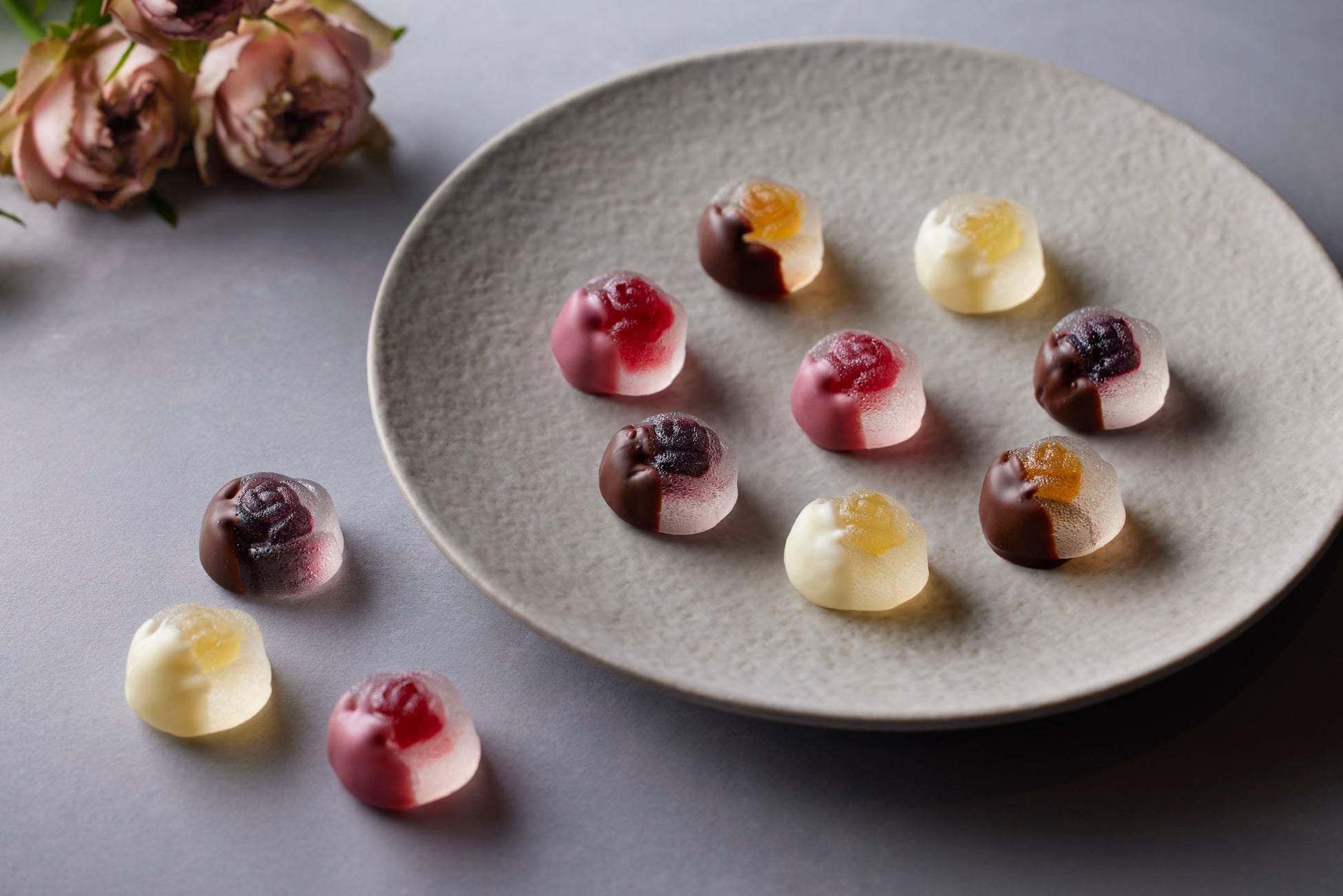 「果内水晶ショコラ」は、日本の伝統菓子“琥珀糖”に果実のパート・ド・フリュイを閉じ込め、チョコレートと掛け合わせた繊細なひと品。透明感のある輝きと甘酸っぱいゆずやカシスの香りに異なるテイストのチョコレートが織りなす、新しいショコラの体験をお楽しみいただけます。