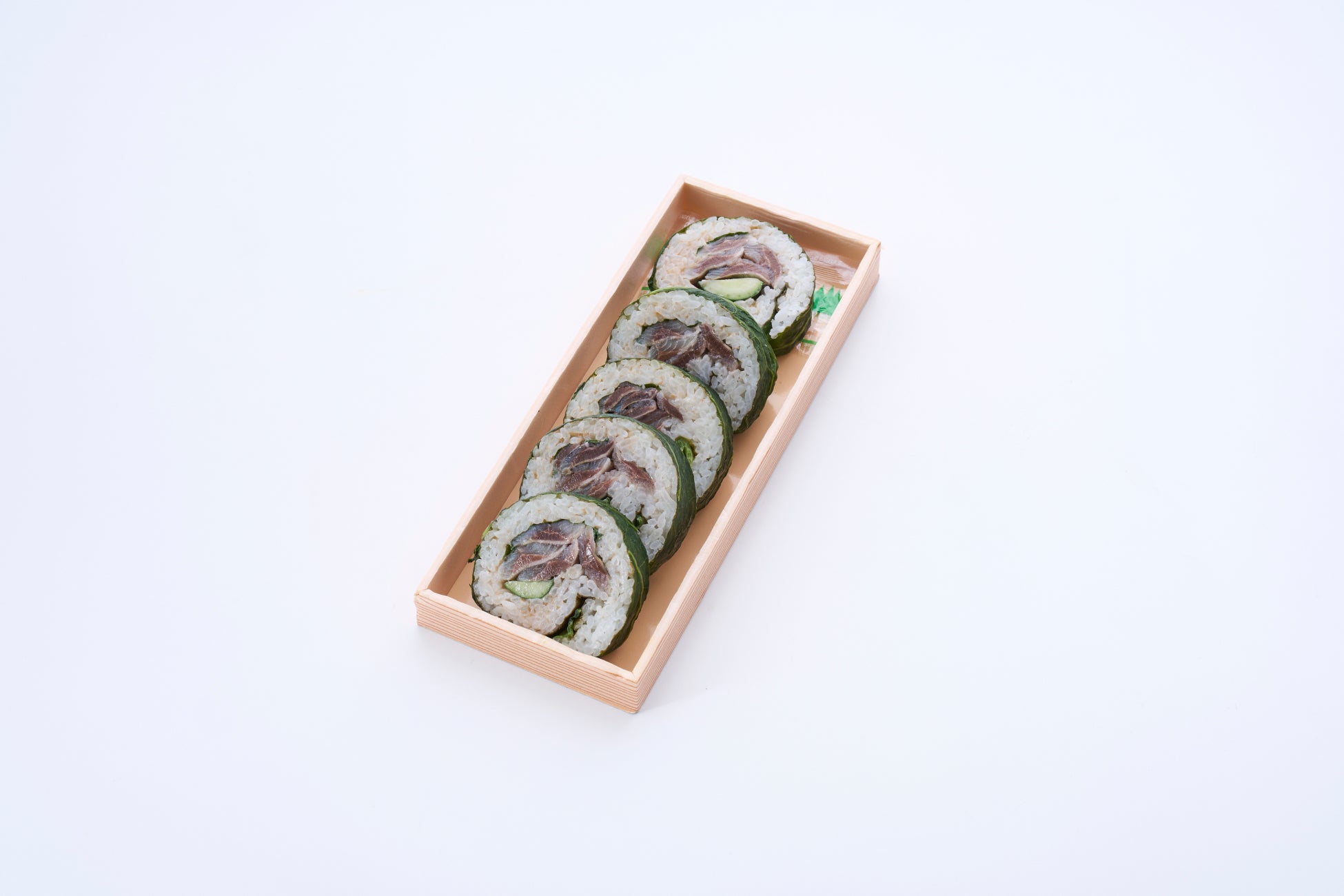 程よく脂の乗ったいわしに梅肉、大葉、きゅうりを加え海苔と高菜で二重巻きにしました。サッパリ、スッキリ相性抜群の味わい。