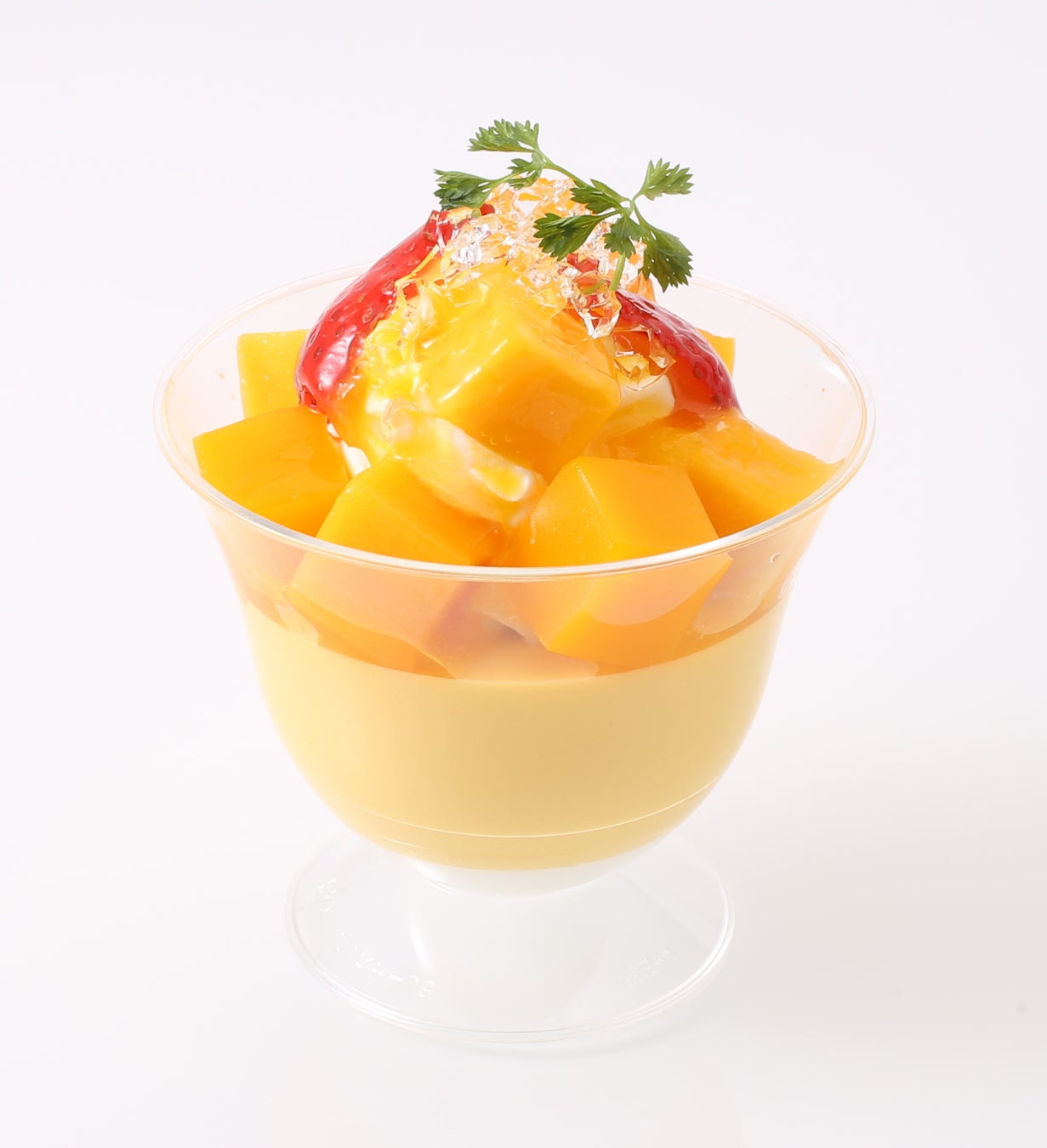 甘みが濃い「アルフォンソマンゴー」を使ったとろりとしたマンゴープリンに、マンゴーの果肉とゼリーをのせて。