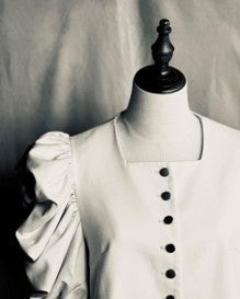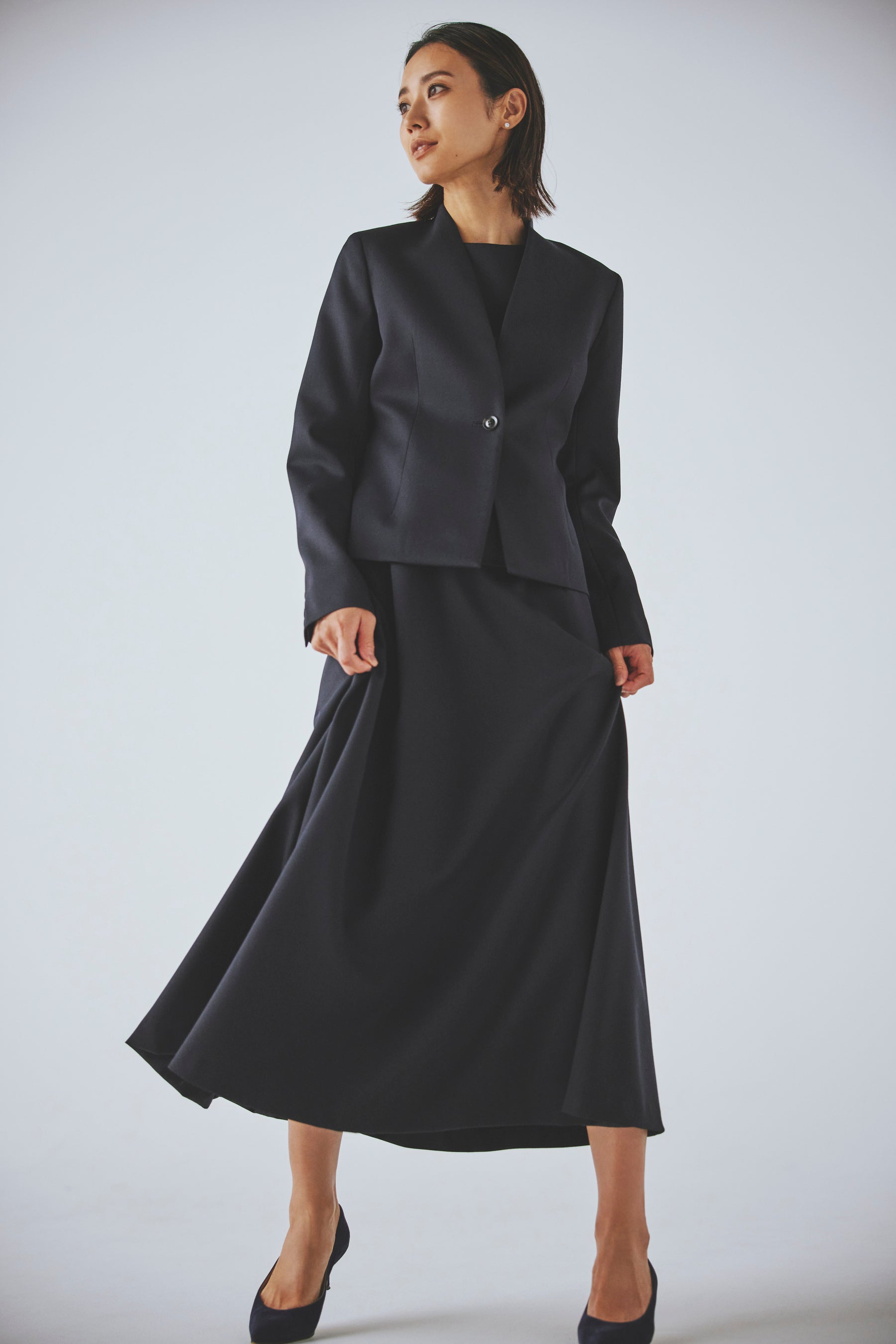装飾がなくても女性の美しさを引き立てられるよう、ライン(切替・シルエット)の入れ方にこだわり、王道は外さない、ミニマルなフォーマルウェア。