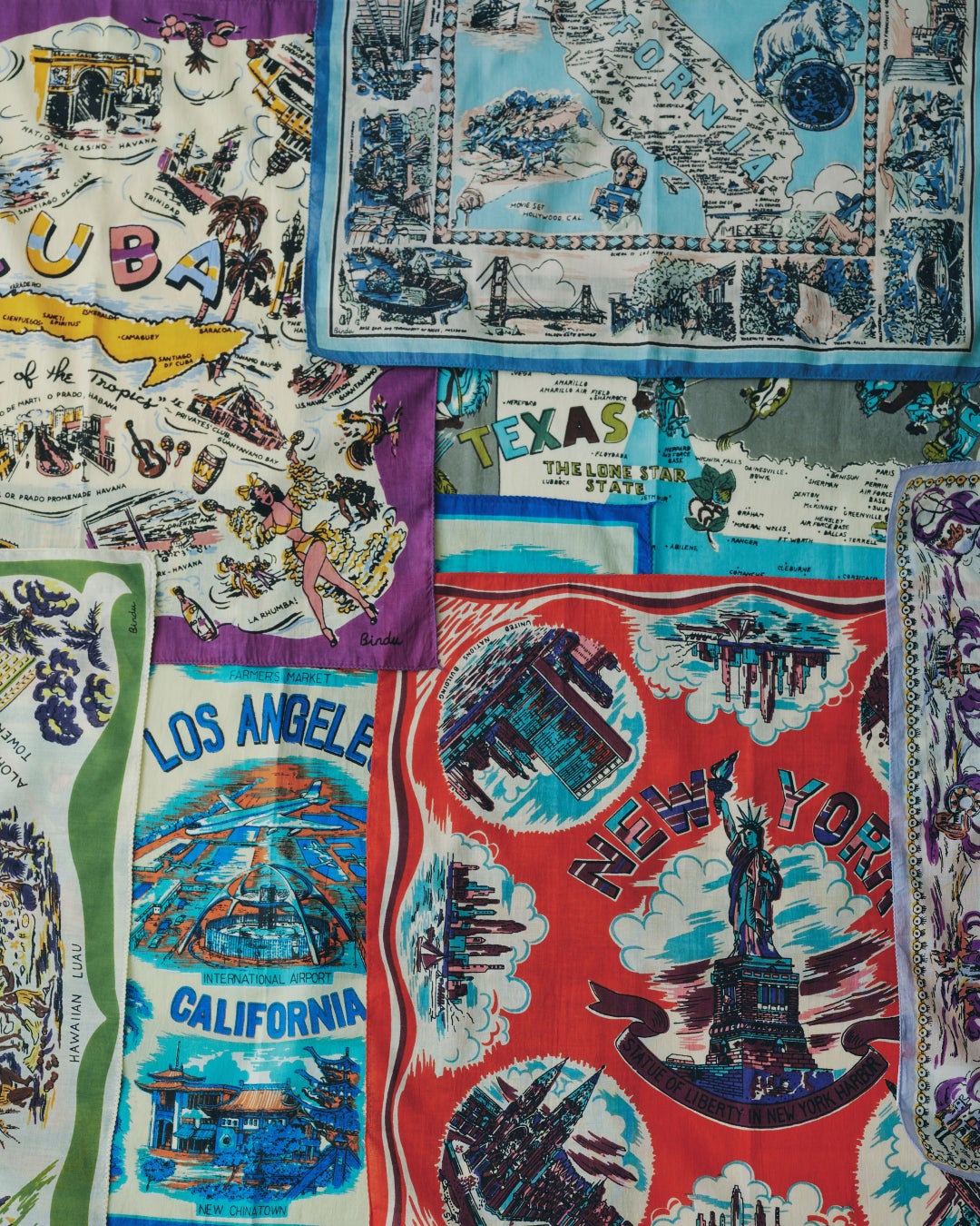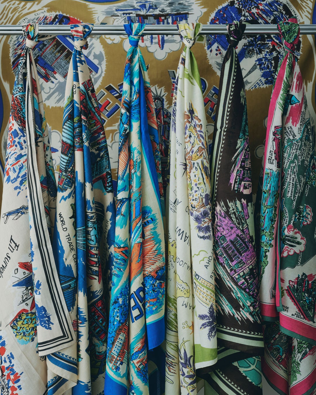 スーベニアマップをモチーフにした〈BINDU〉のシリーズは、50×50cmのバンダナ、64×64cmのスカーフ、100×100cmの大判スカーフの3サイズ展開。いずれもコットンヴォイル(コットン100%)を使用した薄手で軽やかなインド綿に、手捺染ならではの風合いを加えた仕上がりが特徴。サイズごとに使い方の幅が広がり、スタイリングにさりげないアクセントを加えてくれるアイテムです。