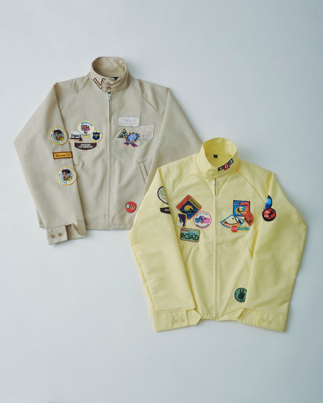 今では希少なSPORTS MASTERのデッドストックのコットン×ポリエステル素材のスイングトップに、OLDワッペンを一点ずつデザインして縫い付けた特別な一着。すべて異なる組み合わせによる一点物で、当時にはないバランスと今の気分で再構築。