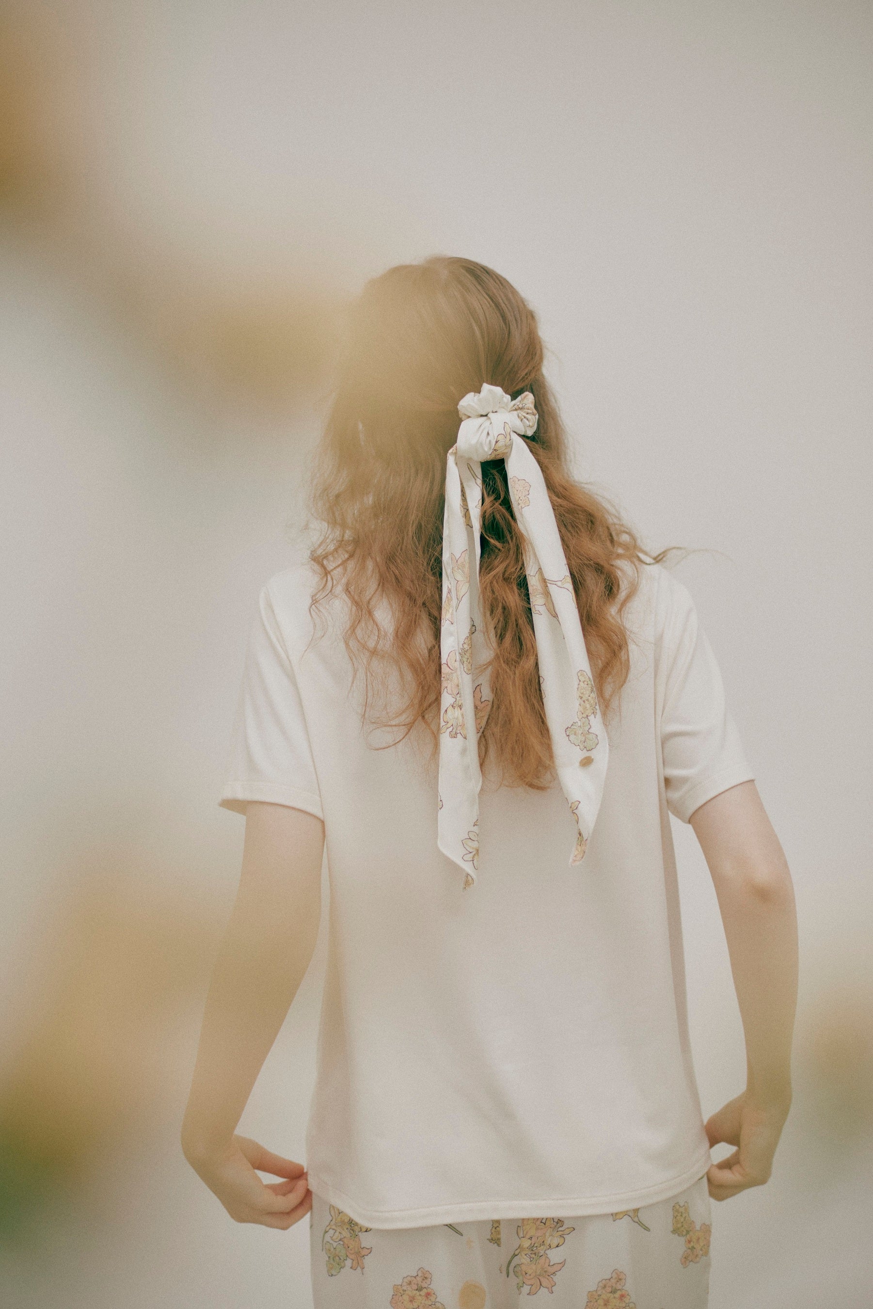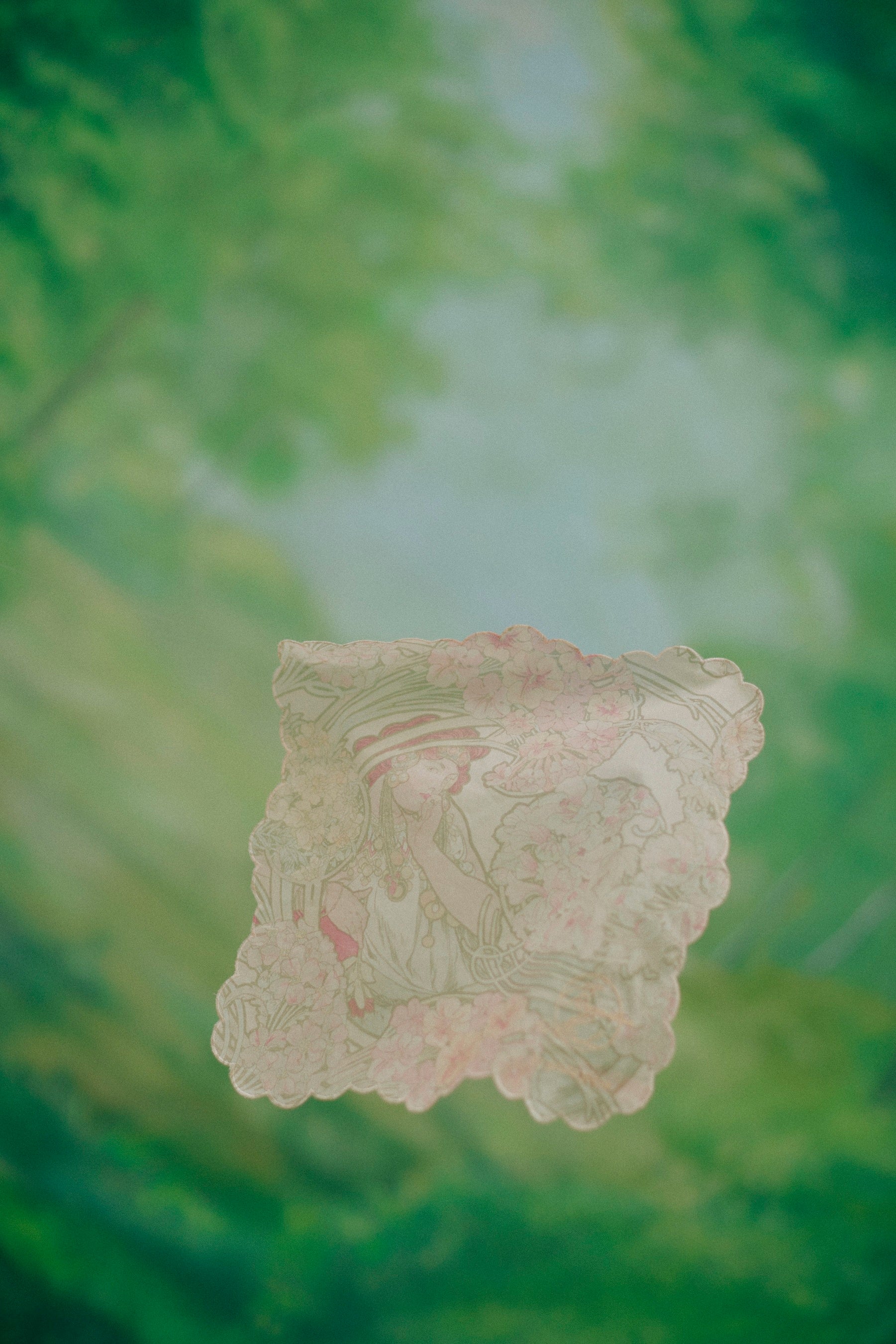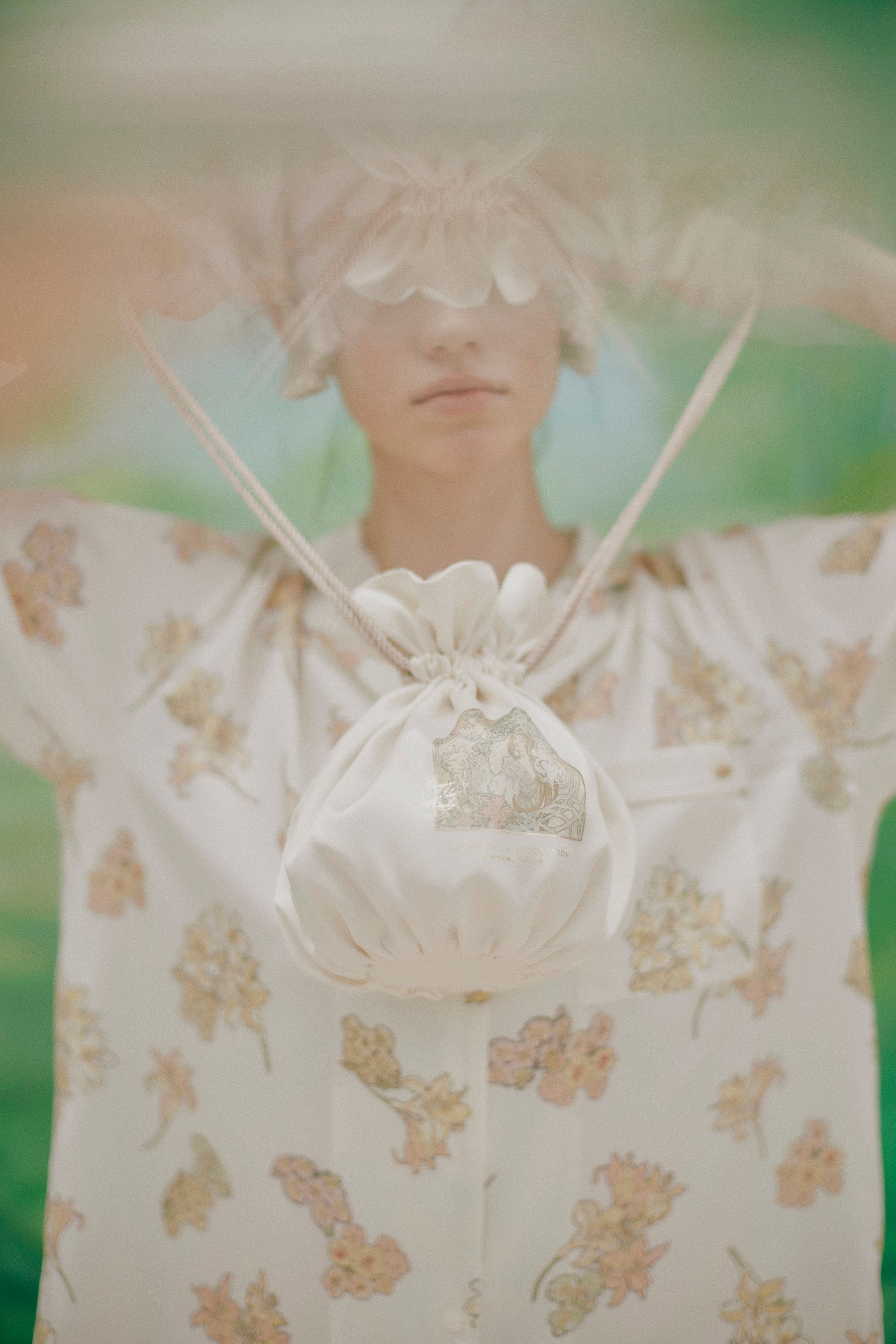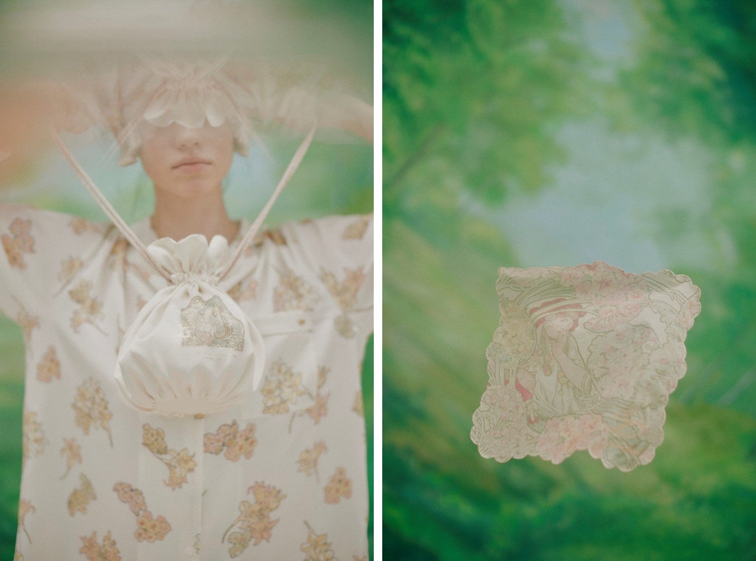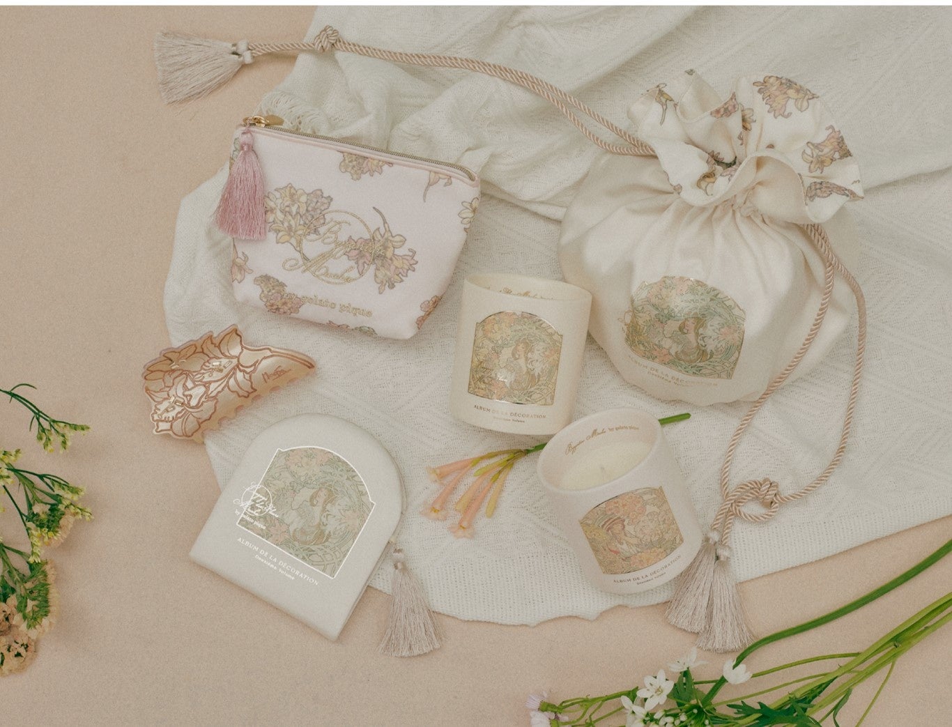 アイコニックな花柄のリボンシュシュやティッシュポーチの他、それぞれの作品をプリントしたスカラップ仕様のハンカチにタッセル装飾つきのアーチ型ミラー、巾着ポーチ、リリーモチーフのヘアクリップ、さらには作品をイメージした香りのキャンドルもラインアップ。
