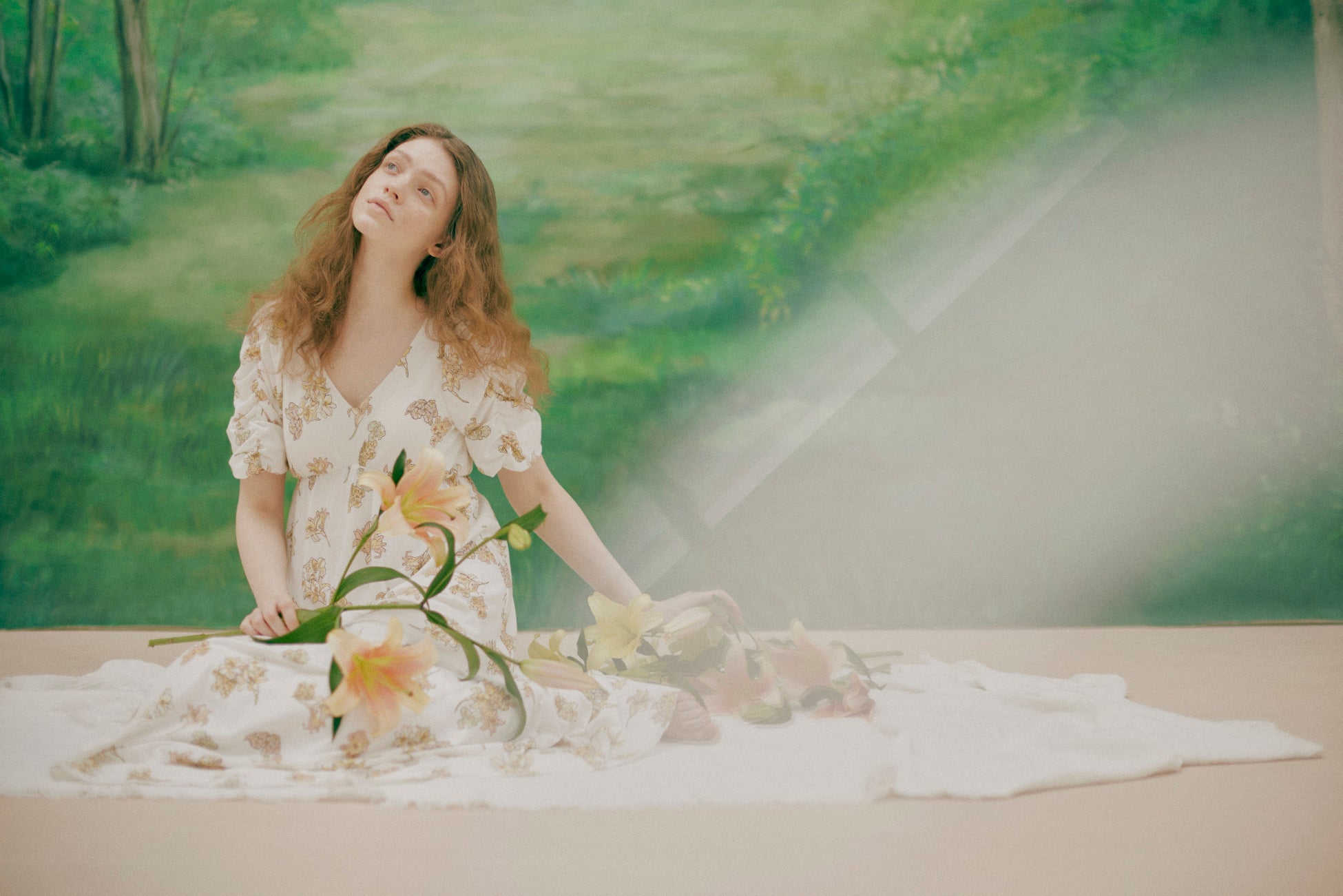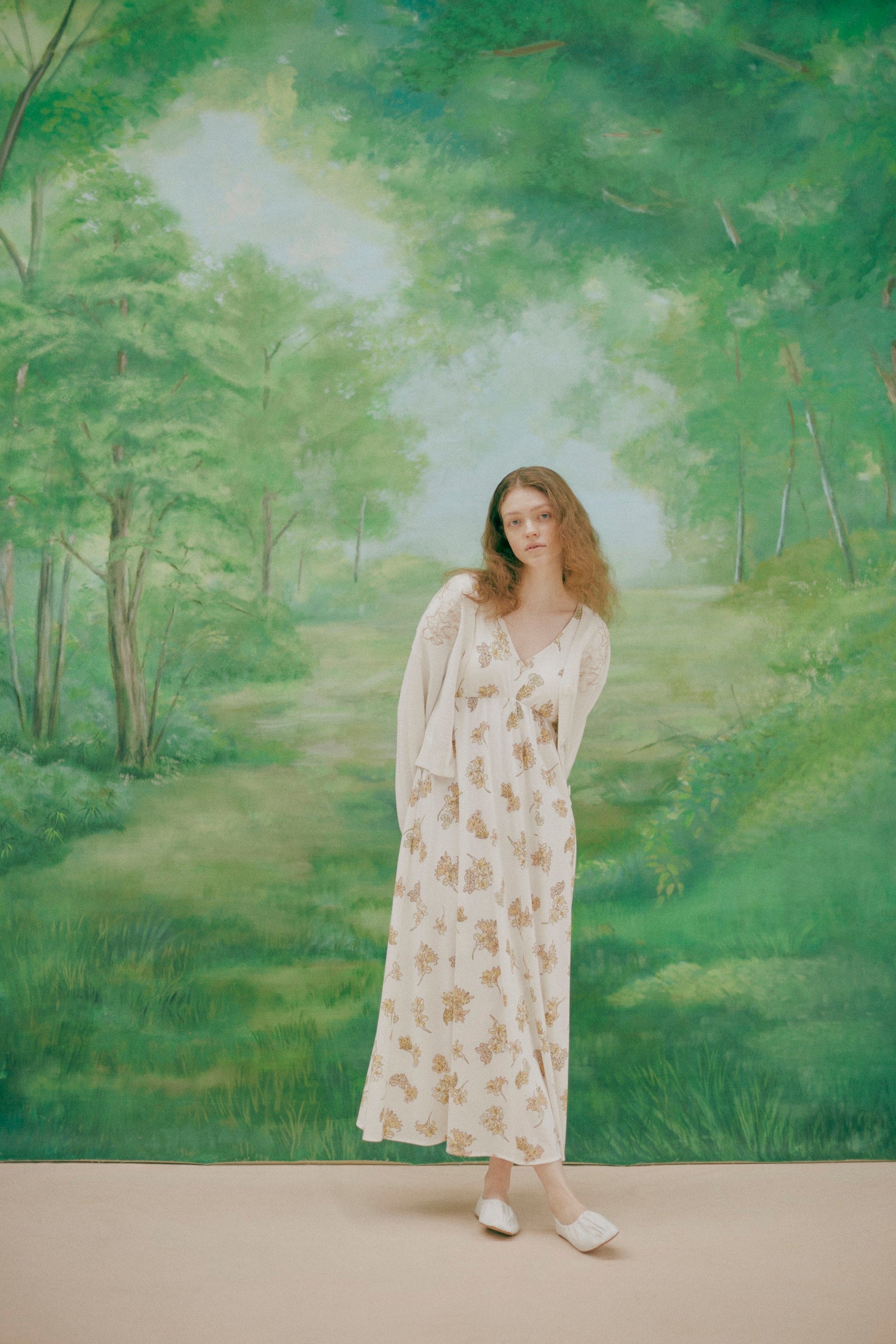 エアリーなパフスリーブと胸元のV開きがアクセントになったワンピースは、『花言葉』で女性がまとうドレスから着想を得て、スタイルアップ効果にもこだわった一枚。
