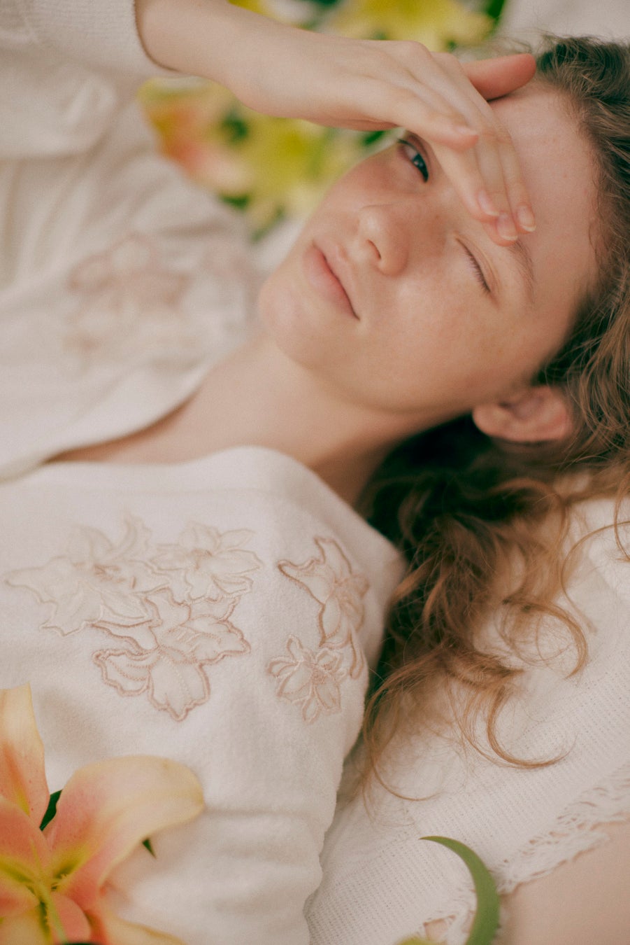 胸元には『花言葉』の象徴、揺れるようなリリーの花をオーガンジー刺繍で。