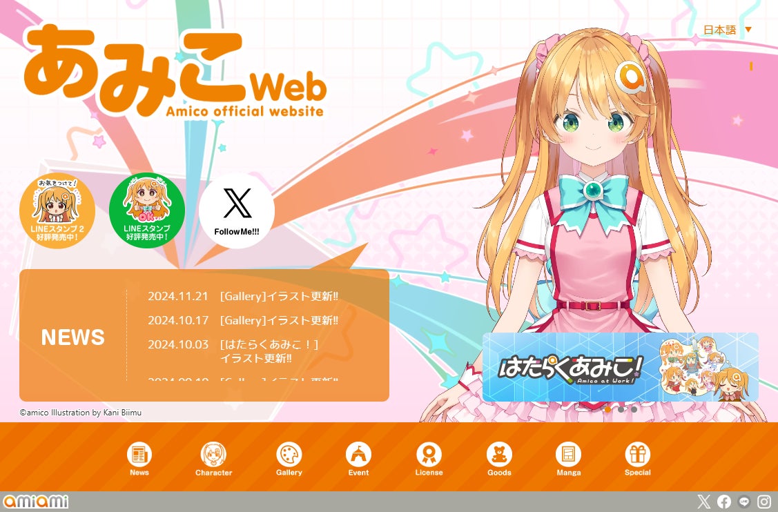 「あみこ」の公式ホームページ。様々なイラストレーターが描く「あみこイラスト」、あみこ参加イベントの情報などを掲載。この他に、三面図・設定画も掲載し立体イベントでの「アマチュア版権」「法人版権」の受付も行っています。