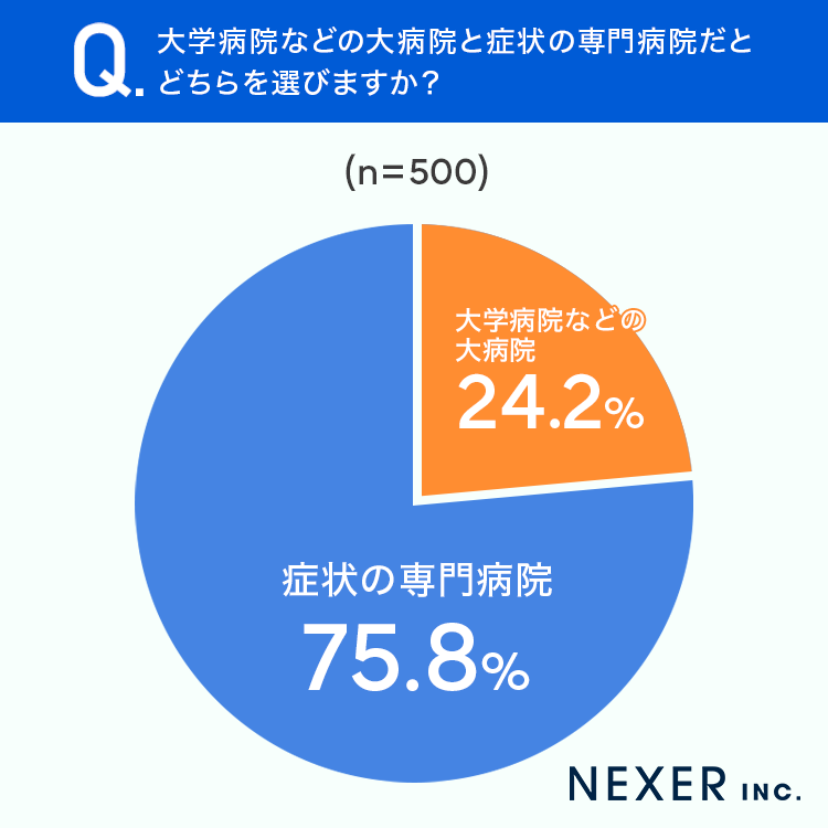 その結果「症状の専門病院」が75.8%、「大学病院などの大病院」が24.2%でした。