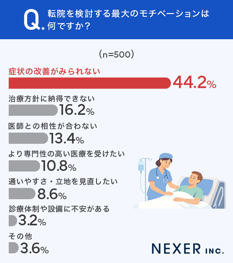 ■44.2%が、転院を検討する最大の理由は「症状の改善がみられない」と回答