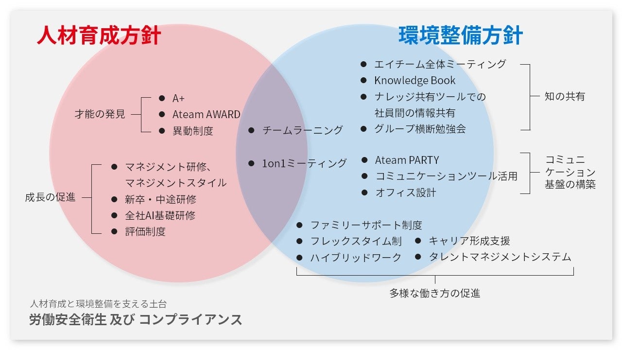 当社グループは、「才能の発見」と「成長の促進」をテーマに人材育成方針を定め、“Ateam People”が創造性を発揮できるよう、「知の共有」「コミュニケーション基盤の構築」「多様な働き方の促進」をテーマに環境整備方針を定めております。また、人材育成と環境整備を支える基盤として、労働安全衛生やコンプライアンスに関する取組についても推進しております。
