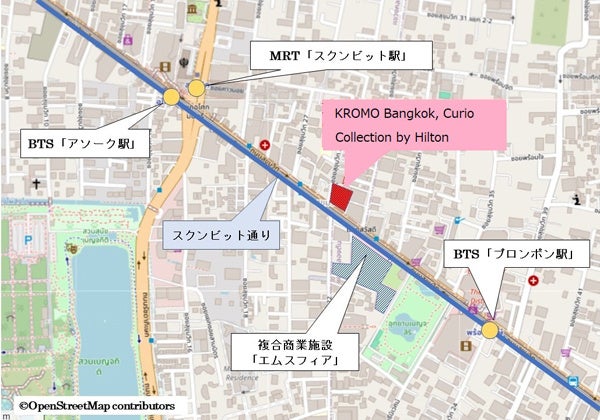 交通面では、バンコク中心部に位置し、高架鉄道BTS(Bangkok Mass Transit System)「アソーク駅」「プロンポン駅」および地下鉄MRT(Metropolitan Rapid Transit)「スクンビット駅」から約8分、「スワンナプーム国際空港」から車で約40分と、アクセスに優れた便利な立地です。