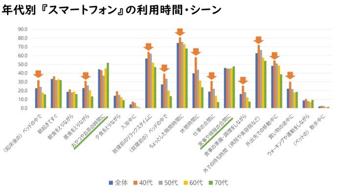 *40代を筆頭にスマホを利用する時間・シーンは多様(橙矢印)。