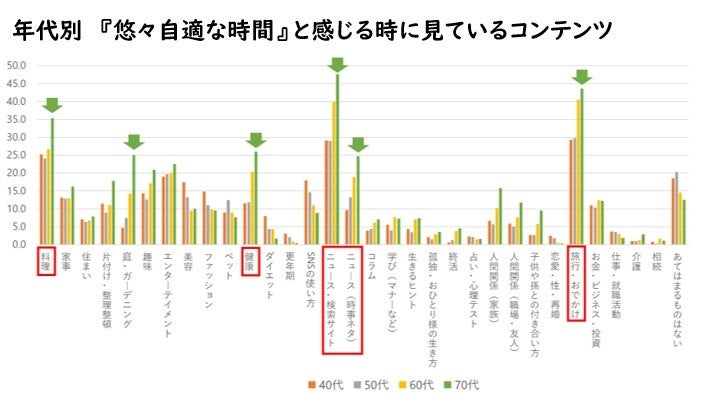 *70代を筆頭に、悠々自適な時間は、“「料理・ニュース・健康”」といった「毎日毎日事」事のコンテンツを見ているときに感じる傾向(赤枠)